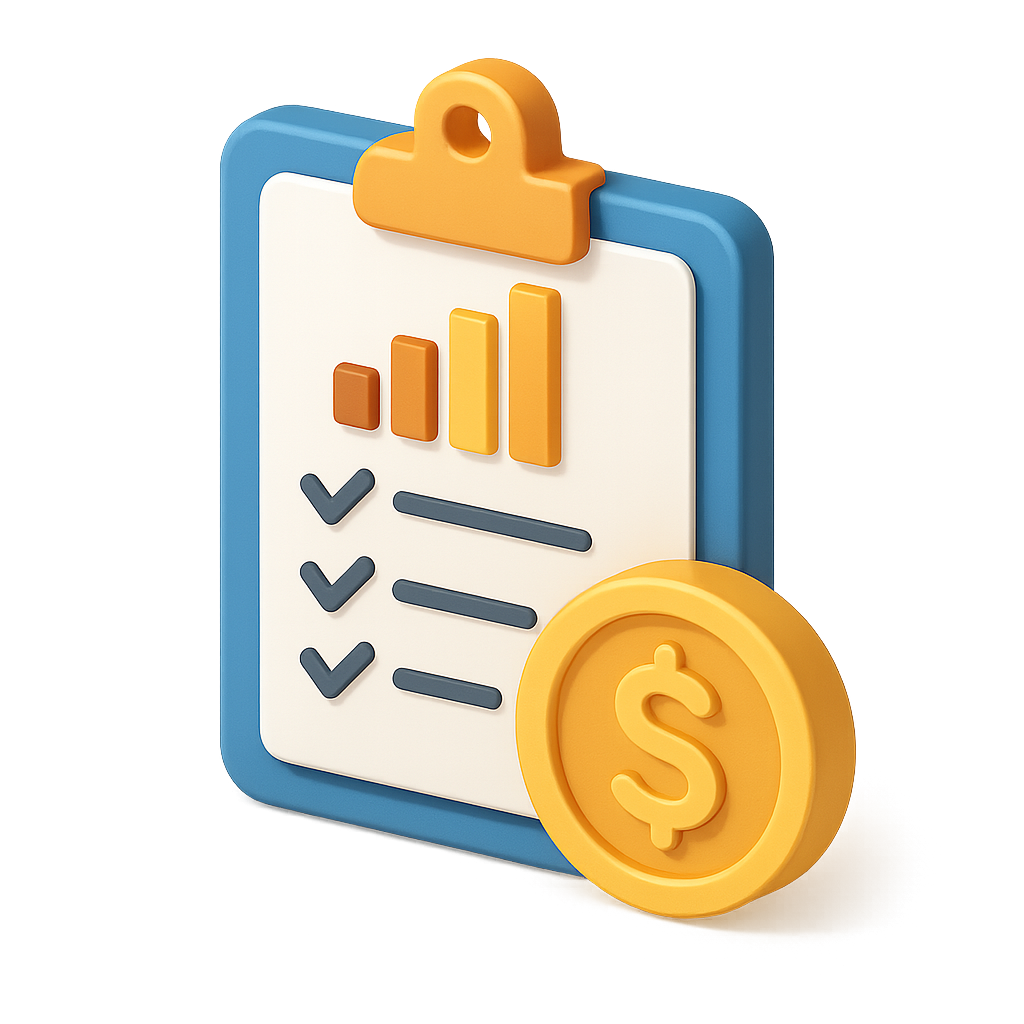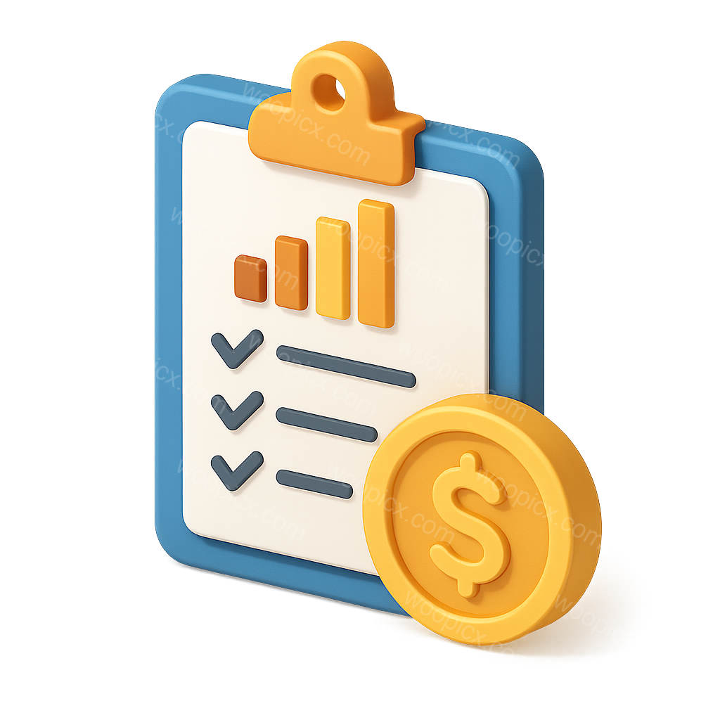 A vibrant 3D icon representing a budget plan, featuring a clipboard with graphs and checkmarks, alongside a gold dollar sign, all set against a transparent background.