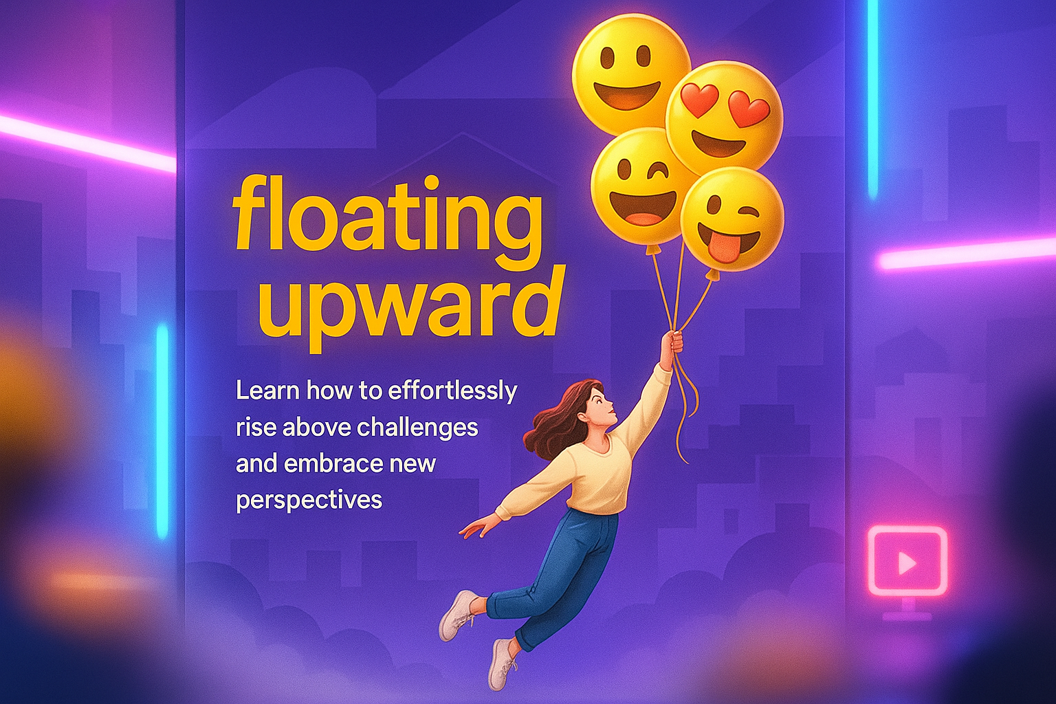 /Collection: /by davooda/Type: PNG/A vibrant and uplifting digital illustration depicting a girl floating upward with balloons, symbolizing overcoming challenges and embracing new perspectives, perfect for motivational content.