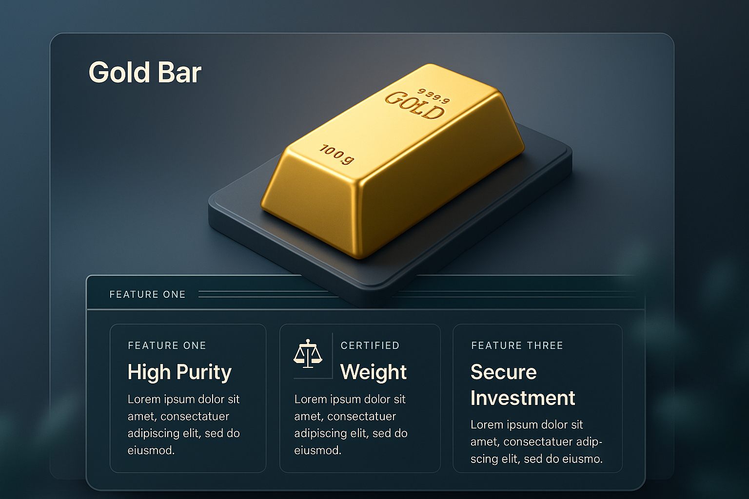 /Collection: /by davooda/Type: PNG/A realistic 3D rendering of a gold bar placed on a sleek base. The background features a smooth gradient, enhancing the visual appeal. Informational blocks highlight key features of the gold bar.