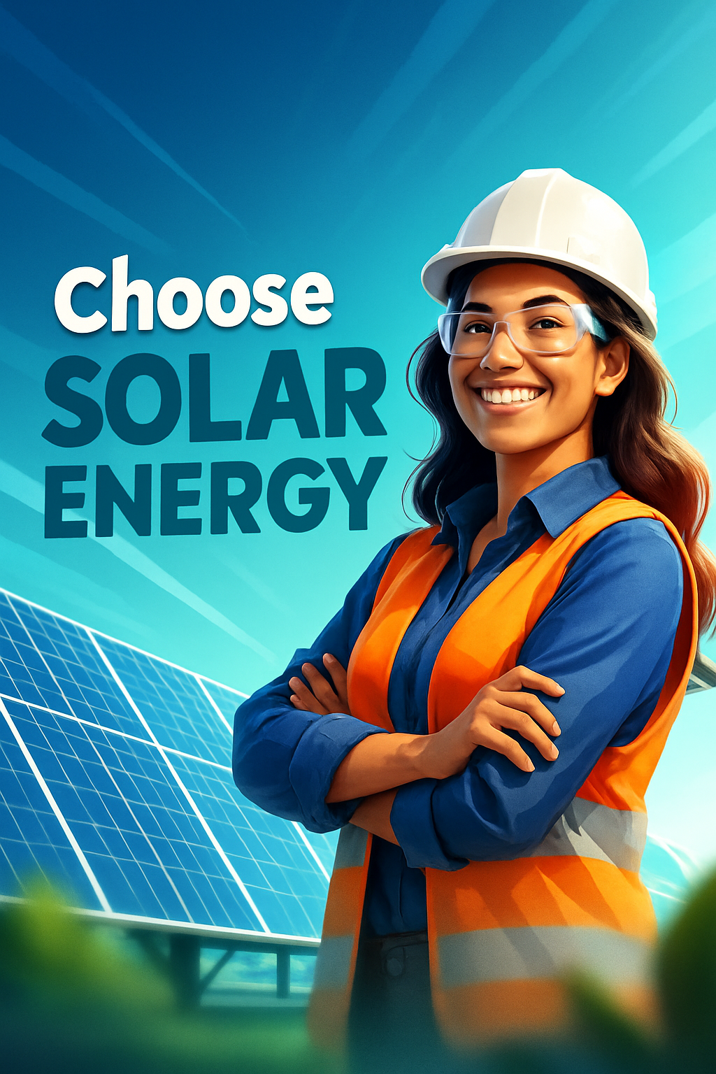 /Collection: /by davooda/Type: PNG/A confident engineer woman stands in front of solar panels, promoting solar energy. She wears a hard hat and safety vest, embodying professionalism and enthusiasm.