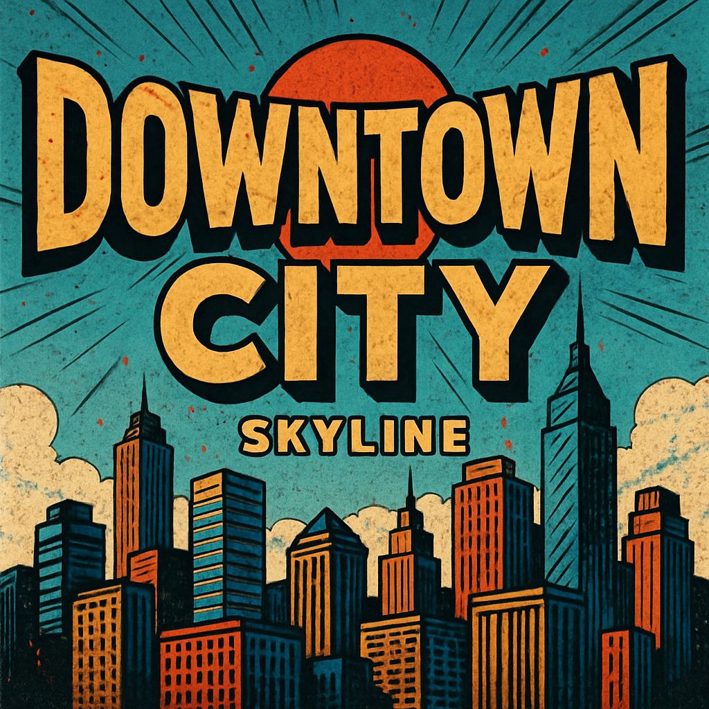 Vibrant graphic illustration featuring a stylized city skyline with bold lettering, ideal for urban-themed projects and promotional materials.