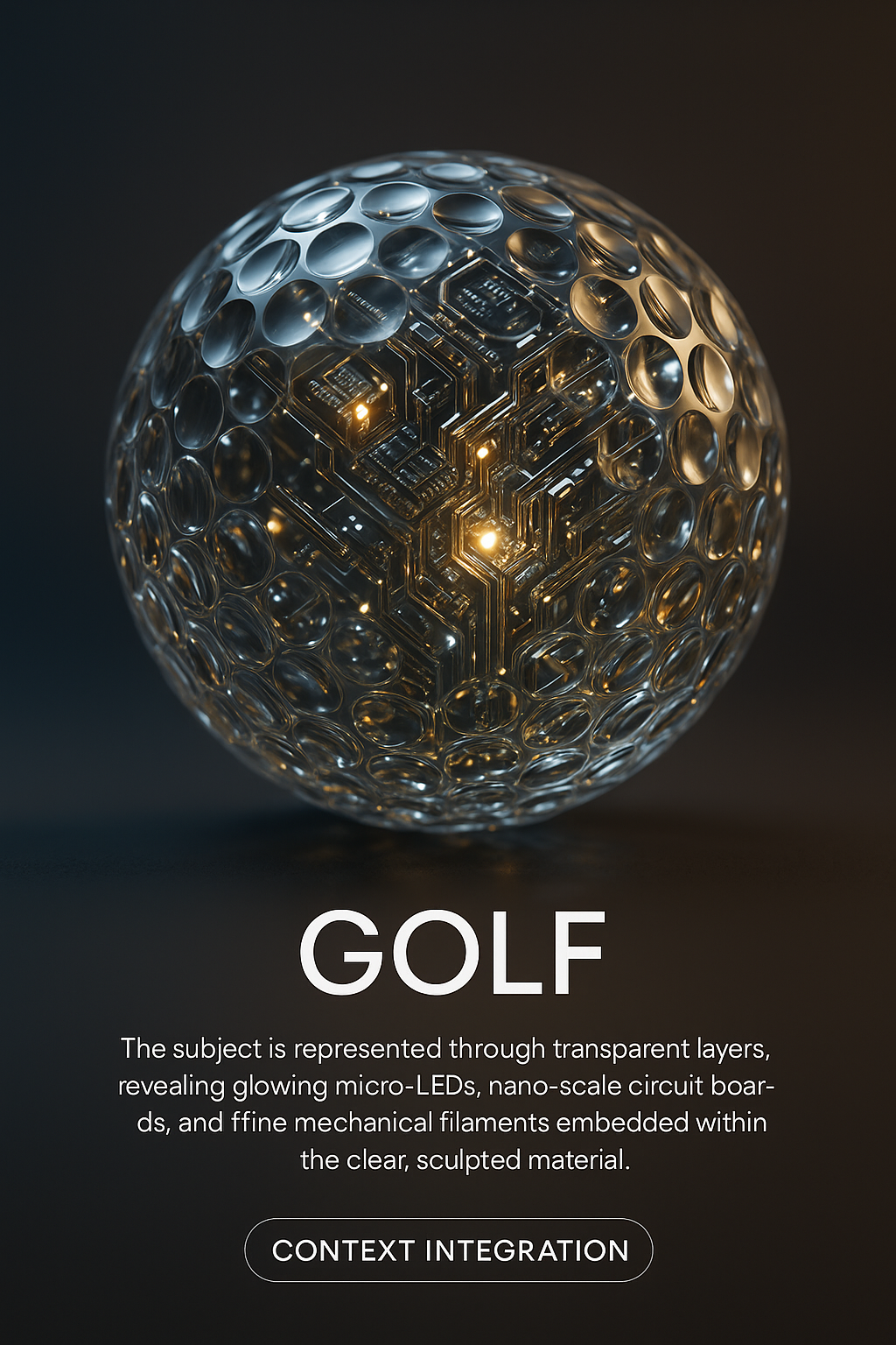 /Collection: /by davooda/Type: PNG/An extreme close-up of a hyperrealistic golf symbol, crafted from clear polymers showcasing glowing micro-LEDs and intricate circuit boards. The elegant composition features metallic reflections and stylish lighting effects.