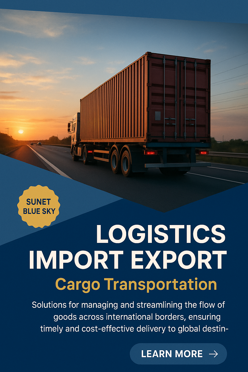/Collection: /by davooda/Type: PNG/A container truck travels on a highway during a stunning sunset, with a blue sky in the background. The image captures the essence of logistics and cargo transportation.