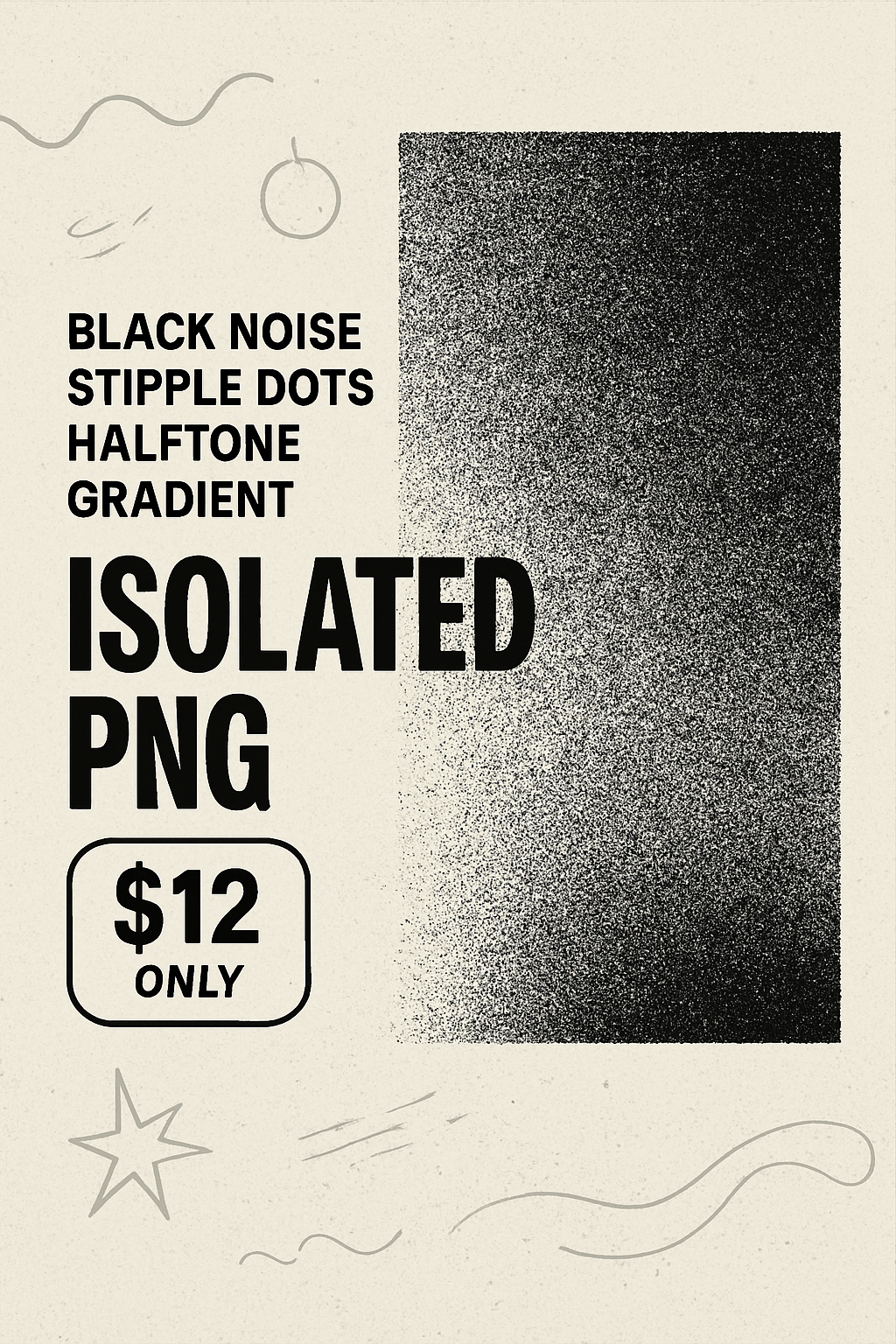 /Collection: /by davooda/Type: PNG/This advertisement showcases a textured grunge background with stipple dots and halftone gradient. It includes bold sans-serif typography with a prominent headline, price tag, and simple contour drawings.