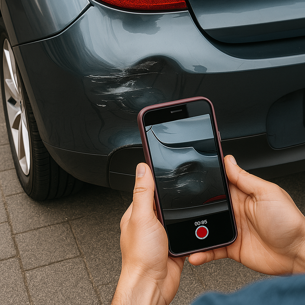 A realistic image showing an individual using a smartphone to record damage on a car's rear bumper. The scene is set outdoors, highlighting the importance of documentation for insurance or repair purposes.