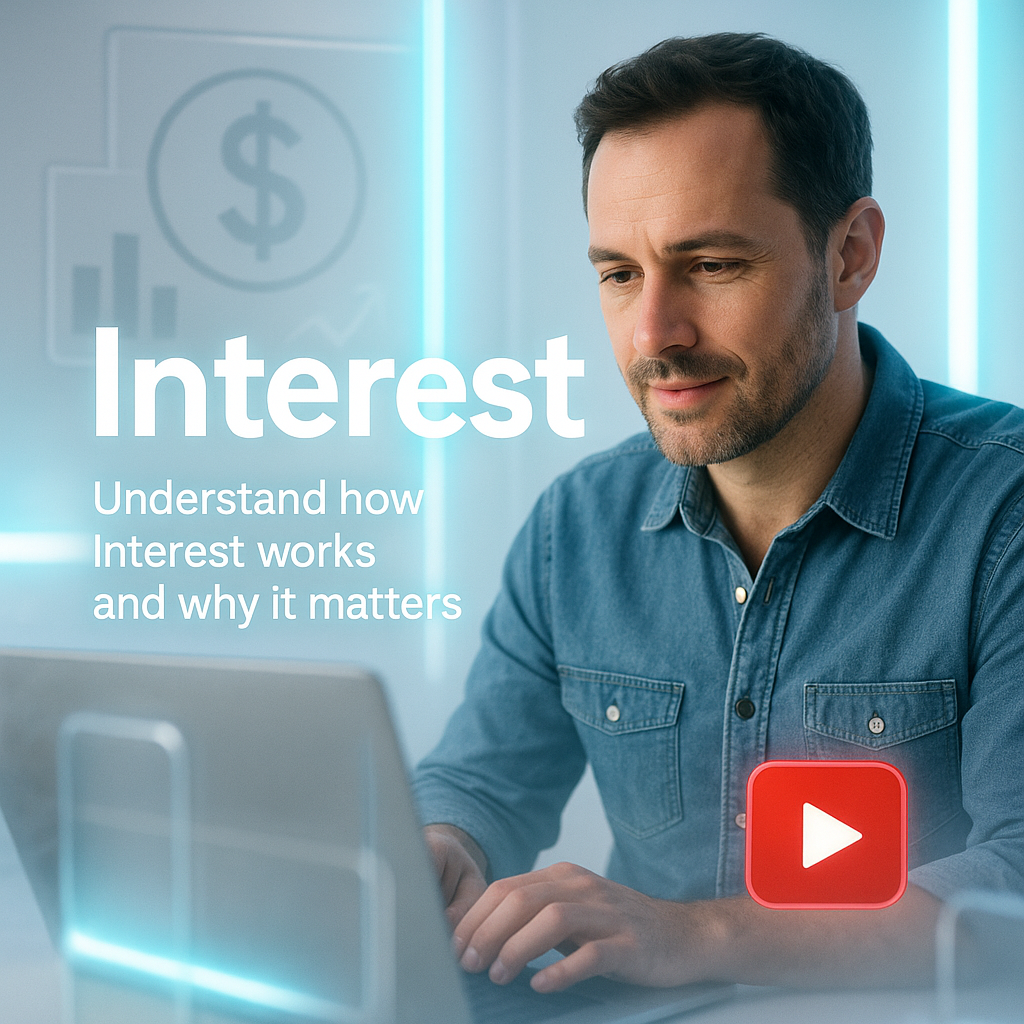 /Collection: /by davooda/Type: PNG/Engaging video thumbnail designed to educate viewers on the concept of interest, featuring a professional individual working on a laptop with modern design elements.