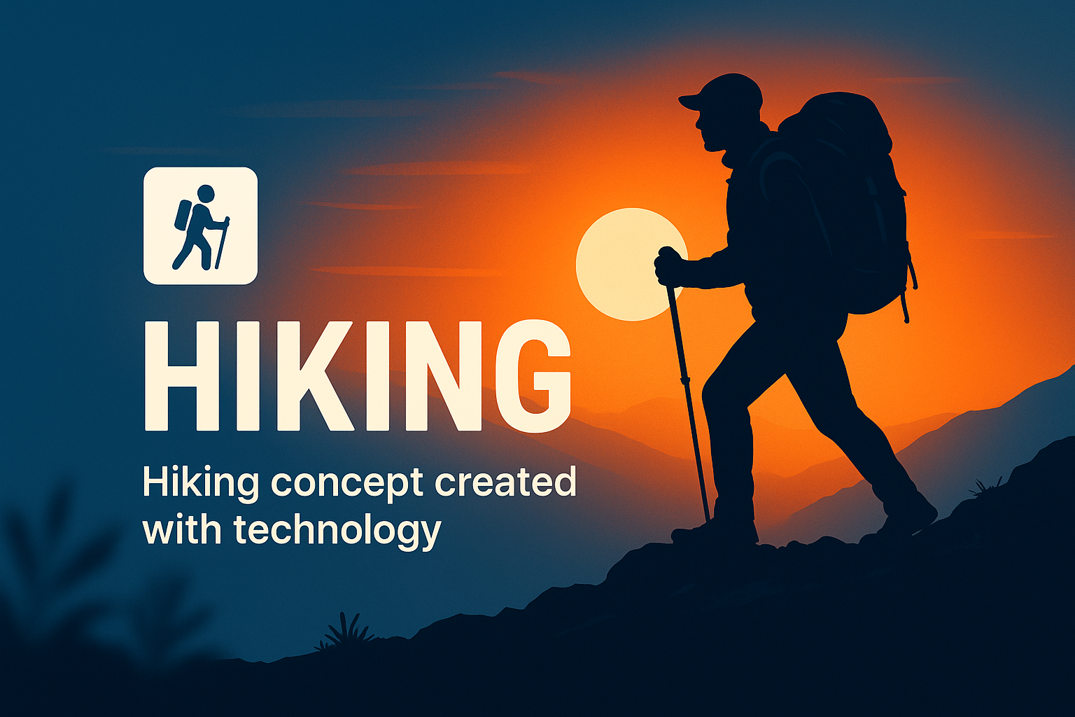 Stylized graphic featuring a hiker silhouette with a sunset backdrop, ideal for outdoor adventure promotions or travel-themed content.