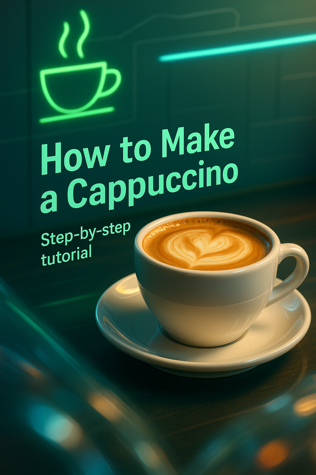 /Collection: /by davooda/Type: PNG/Visually appealing graphic showcasing a cappuccino with a step-by-step tutorial theme. The modern design features vibrant colors and a cozy coffee shop atmosphere, perfect for culinary blogs or social media posts.
