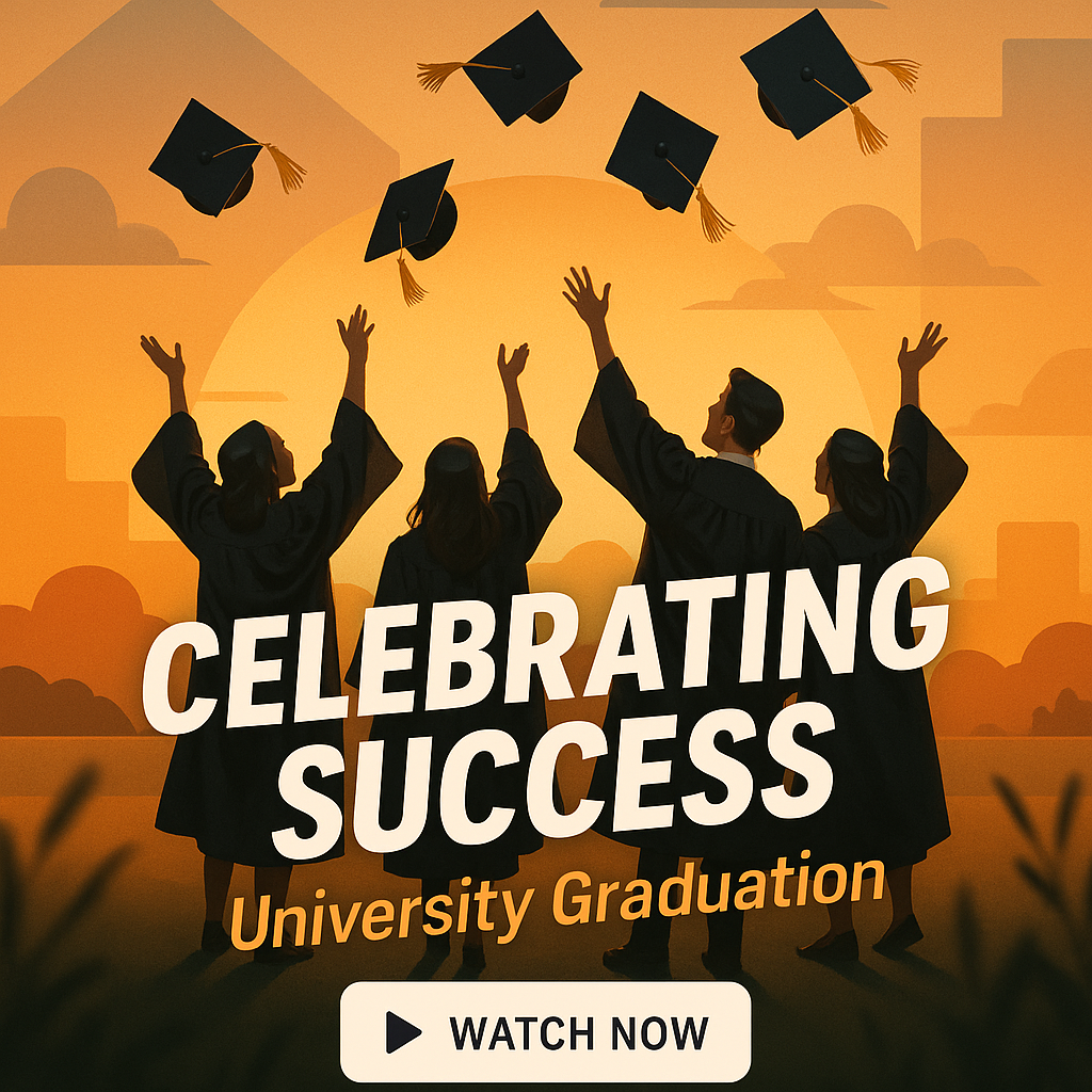 /Collection: /by davooda/Type: PNG/A vibrant social media post showcasing a graduation celebration theme, featuring silhouetted graduates throwing caps against a sunset background. Ideal for university or educational institutions.