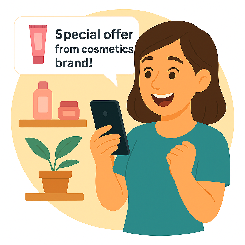 Colorful illustration depicting a happy character interacting with a mobile device, highlighting a special offer from a cosmetics brand. The design is vibrant and appealing, targeting beauty enthusiasts.