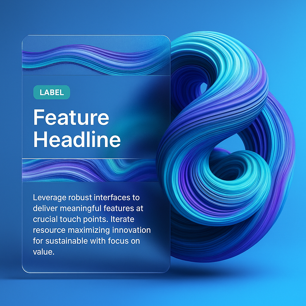 A vibrant 3D illustration featuring swirling patterns in blue and purple tones, integrated with a feature block displaying text and a label. The design emphasizes depth and innovation.