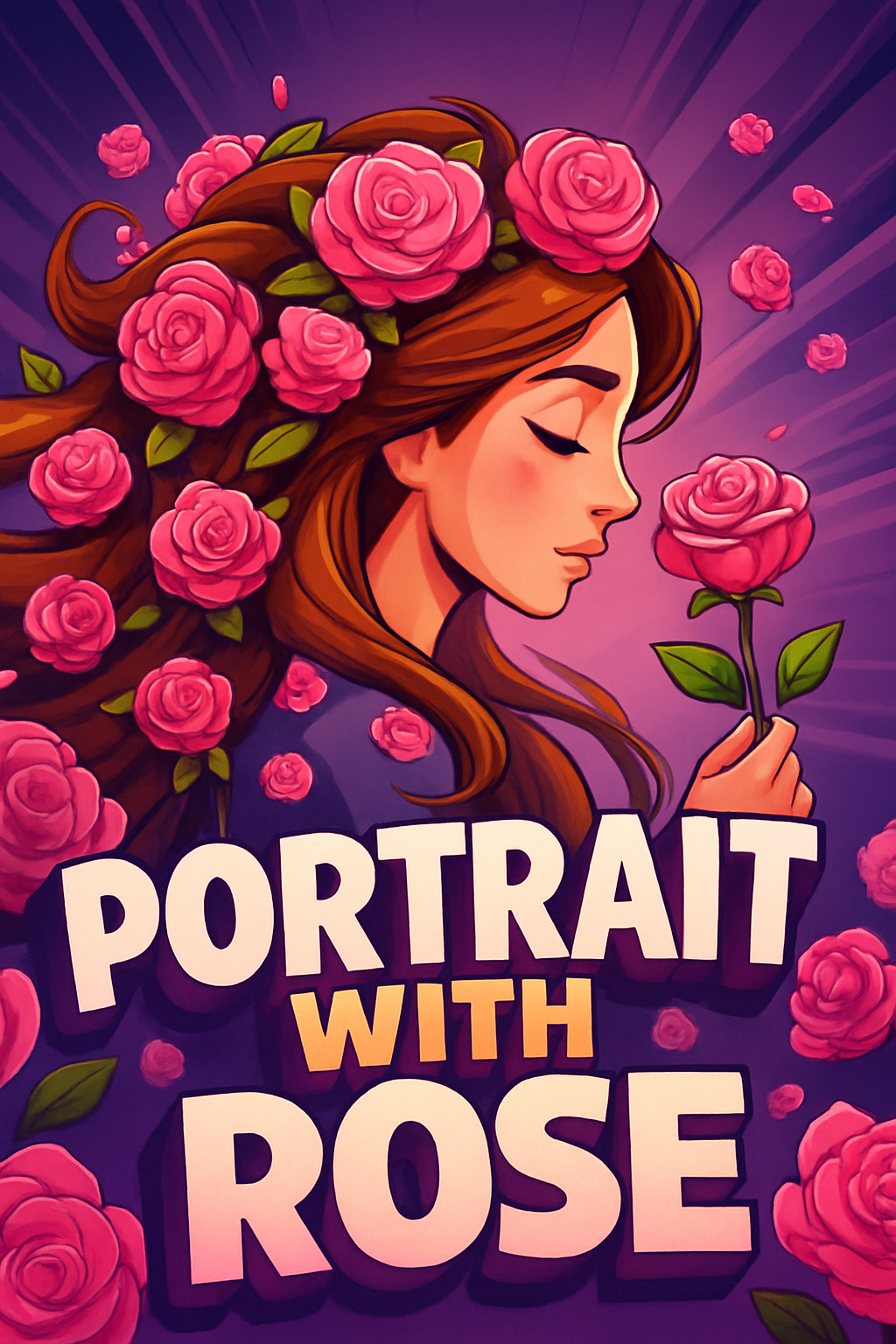 A vibrant and dynamic portrait of a girl holding a rose, adorned with flowers in her hair. The background features a smooth gradient, enhancing the lively atmosphere.