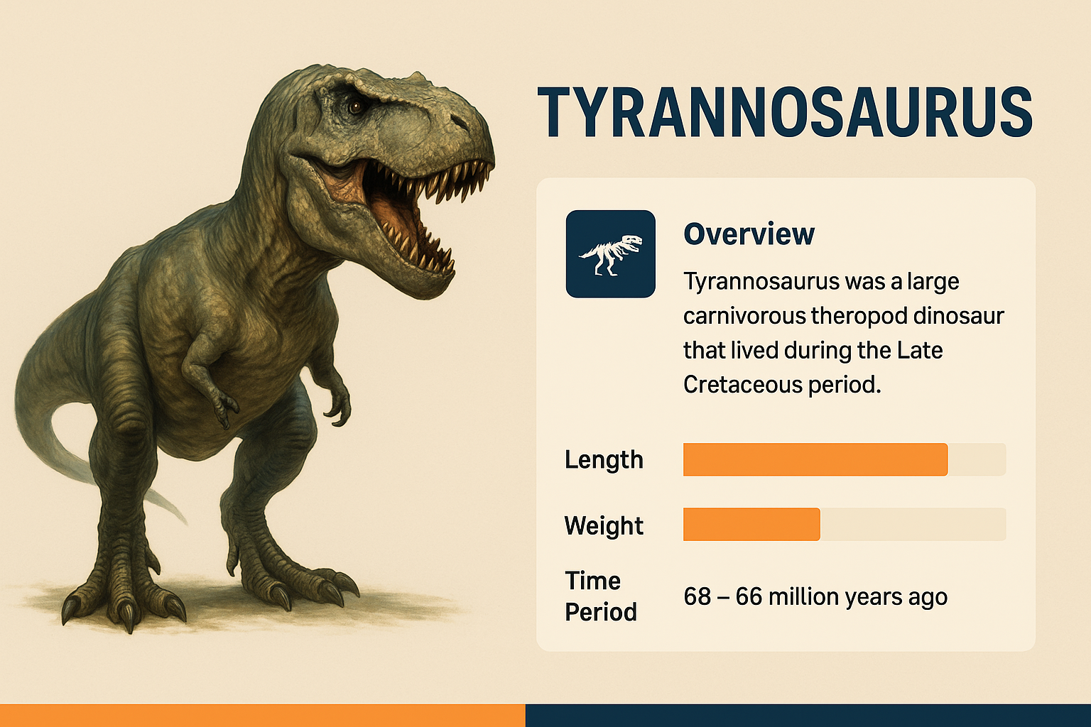 Educational infographic showcasing the Tyrannosaurus, featuring its length, weight, and time period, designed for informative purposes in museums or educational materials.