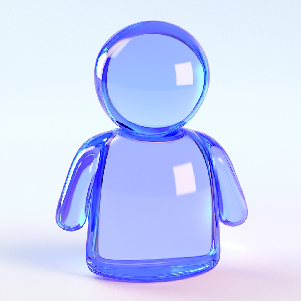 Stylized 3D character icon featuring a transparent blue design, suitable for digital applications and user interface elements.