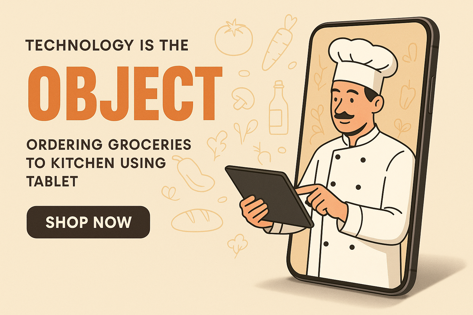 A vibrant advertisement showcasing a chef using a tablet to order groceries, framed by playful outlines and bold typography, creating a dynamic and modern aesthetic.