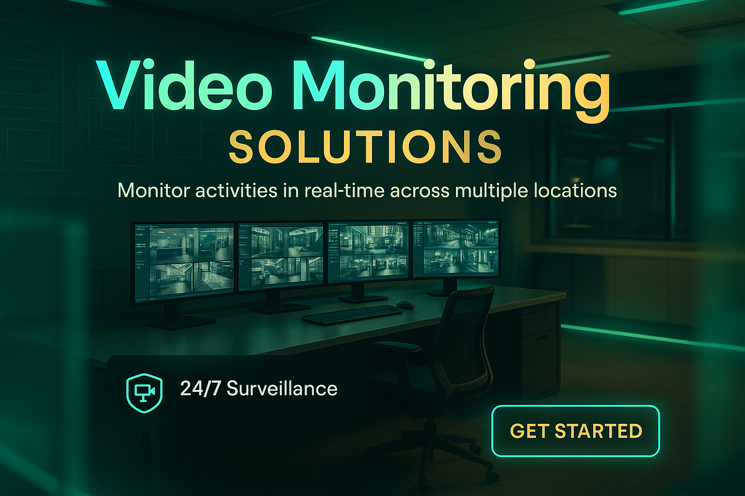 /Collection: /by davooda/Type: PNG/Promotional banner showcasing video monitoring solutions with a sleek design, ideal for tech and security-related marketing. Features a contemporary workspace with multiple screens.
