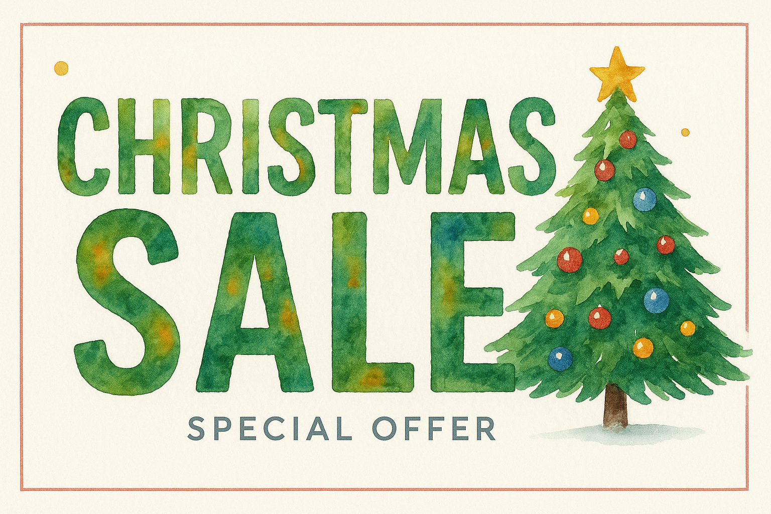 Vibrant promotional banner featuring a Christmas tree and sale announcement, perfect for holiday marketing campaigns. The watercolor style adds a cheerful touch.