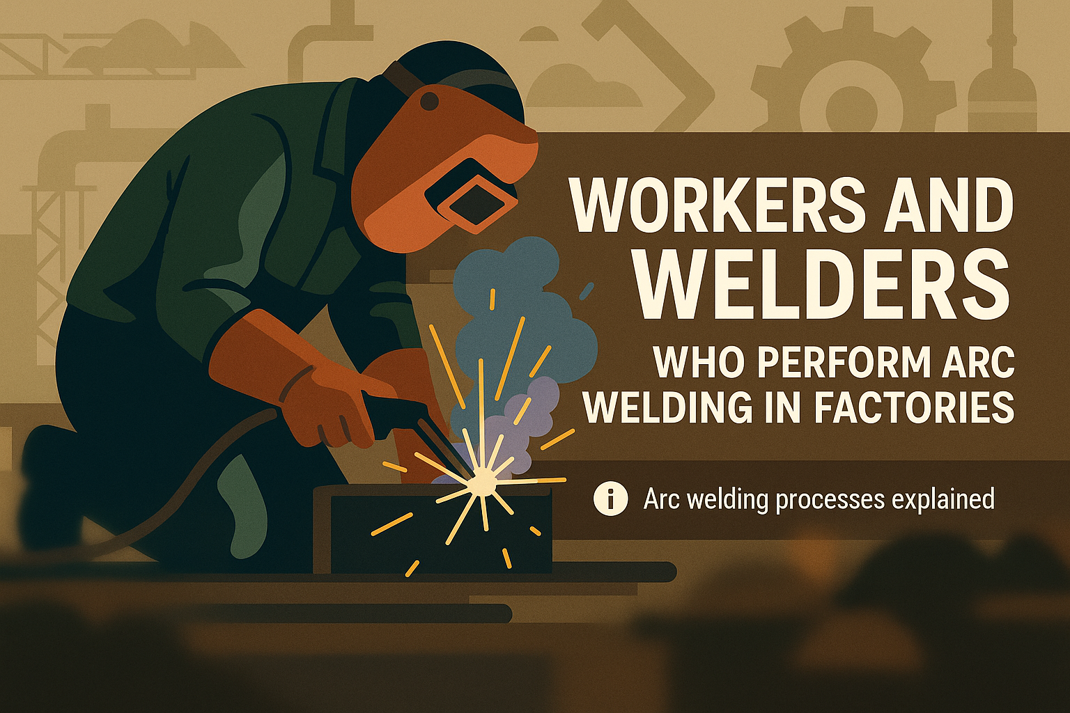 /Collection: /by davooda/Type: PNG/This graphic showcases a welder engaged in arc welding within a factory environment. It features a modern flat design style with warm color tones, ideal for educational or industrial content.