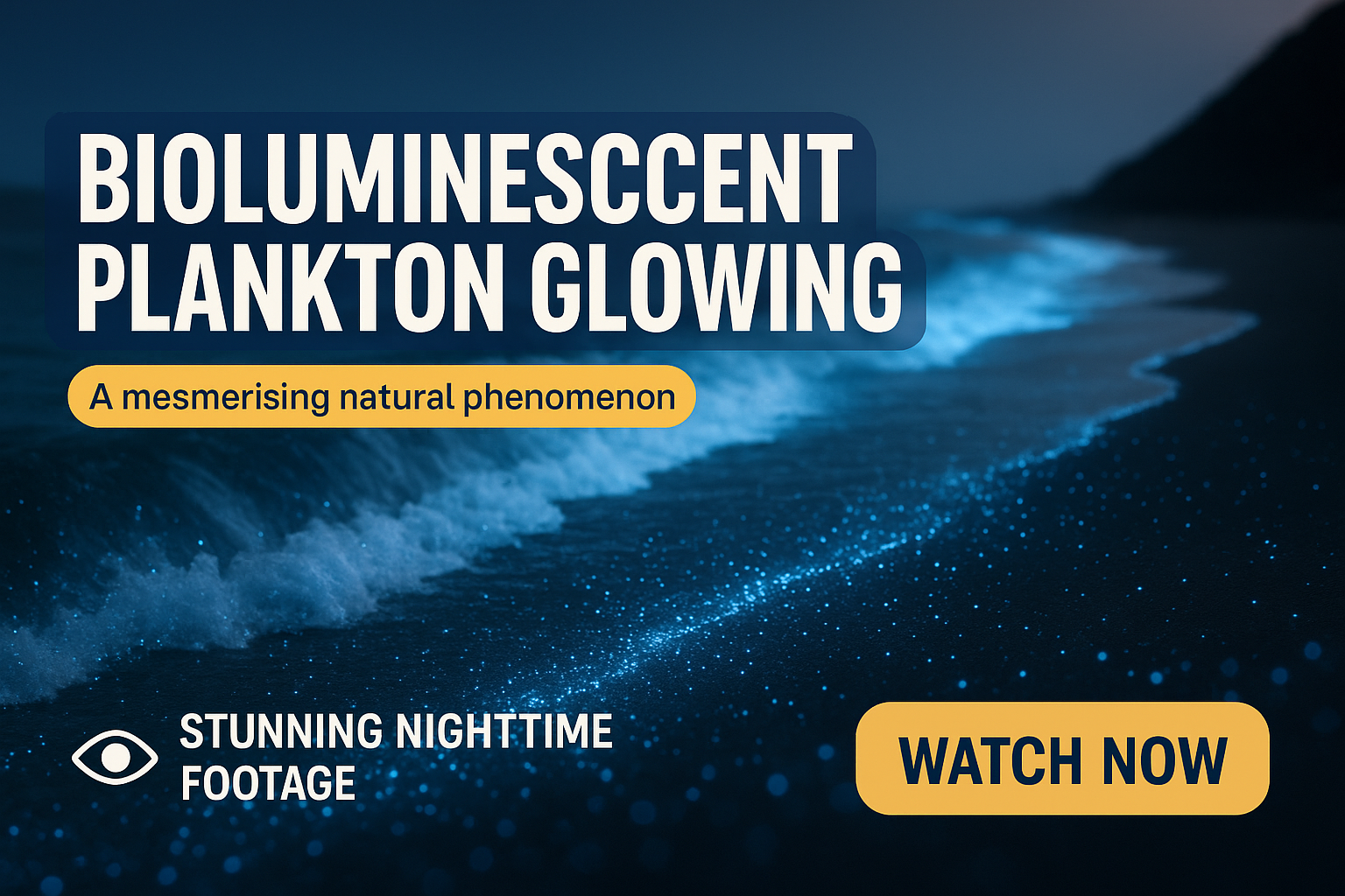 Engaging video thumbnail showcasing the mesmerizing glow of bioluminescent plankton at night. Ideal for nature documentaries or educational content.