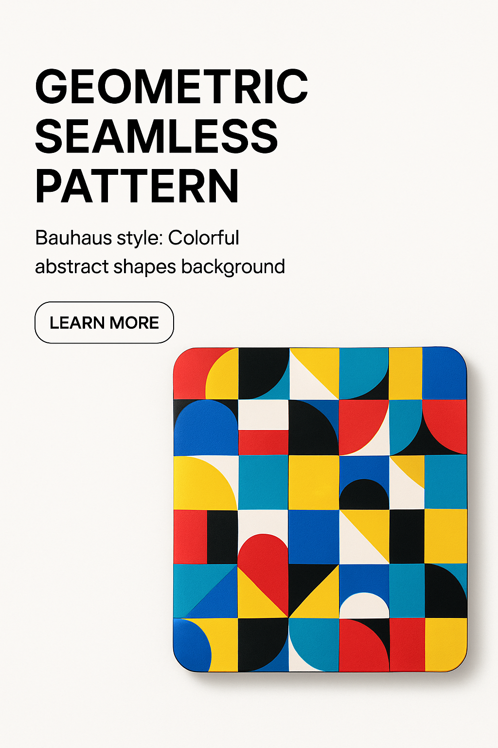 A vibrant Bauhaus-style seamless pattern featuring colorful geometric shapes. The design includes bold typography with a clear hierarchy and a call-to-action button.