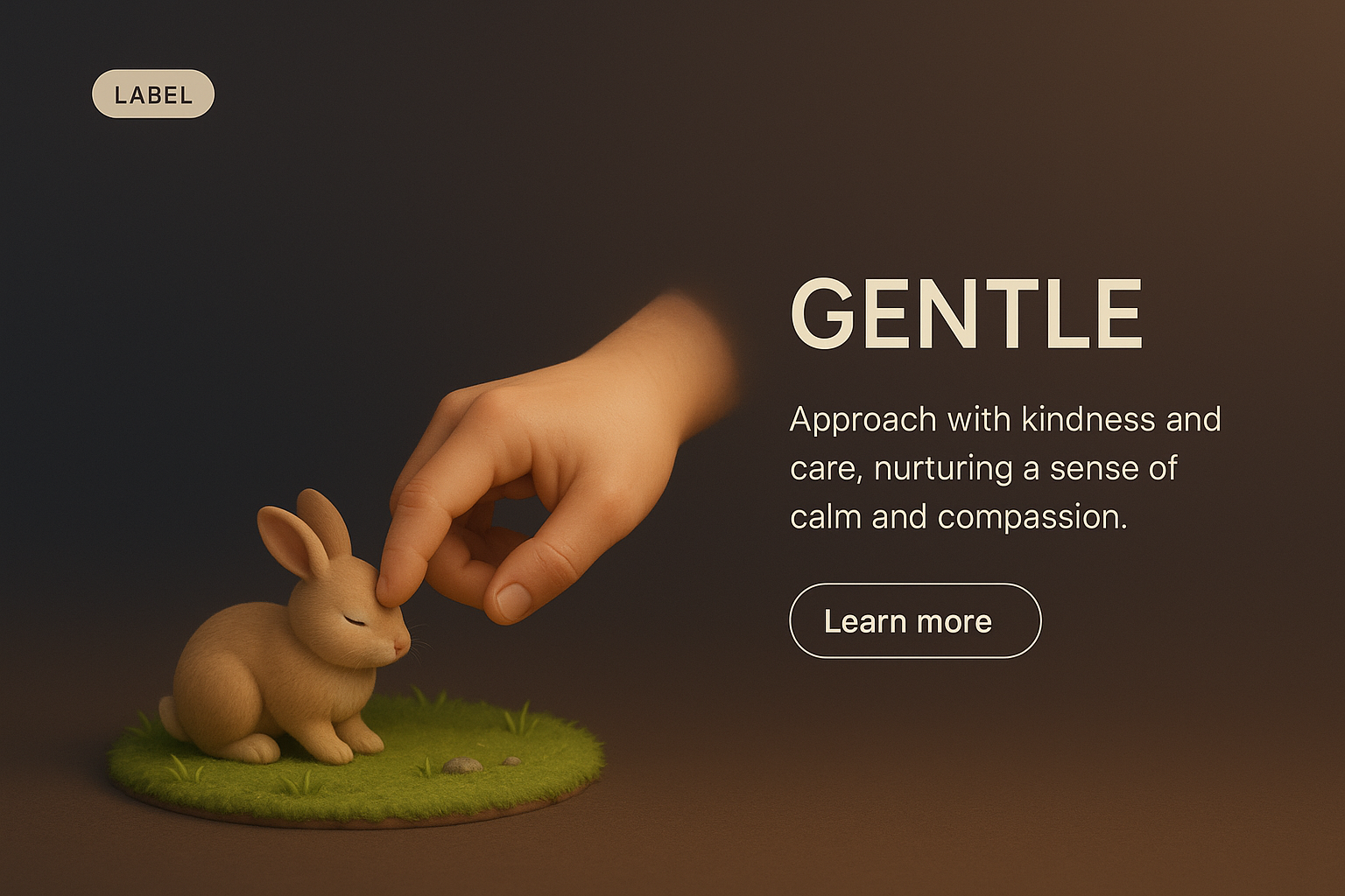 /Collection: /by davooda/Type: PNG/A serene 3D illustration featuring a hand gently touching a small rabbit on a grassy base. The dark gradient background enhances the calm and nurturing theme. Text elements include a label and a call-to-action button.