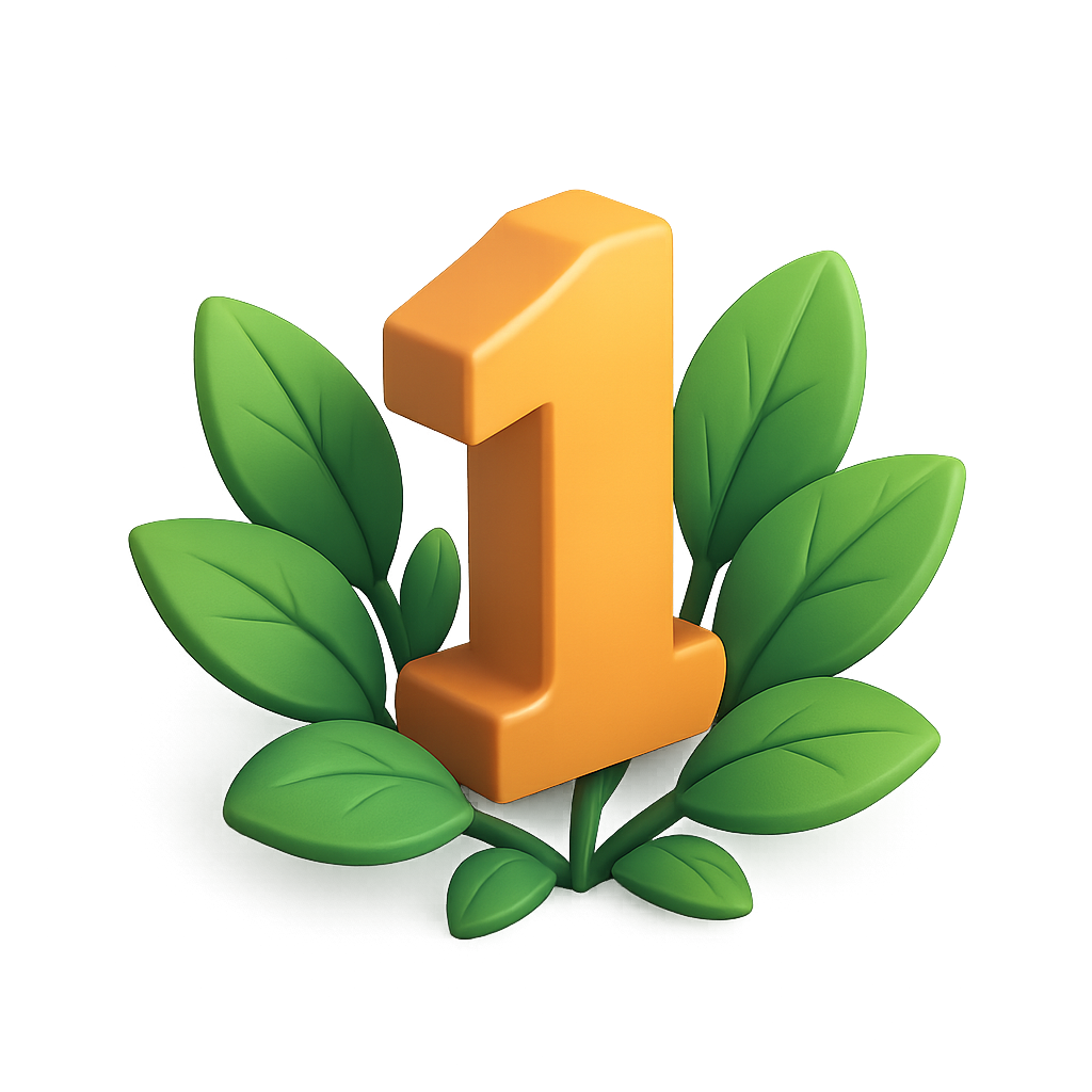 A vibrant 3D icon of the number one, colored orange and surrounded by lush green leaves. The design features a transparent background with a soft glow effect.