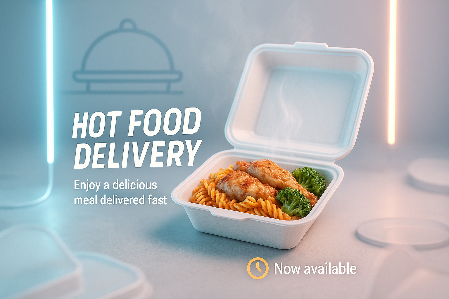 /Collection: /by davooda/Type: PNG/A visually appealing promotional image showcasing a takeout container with steaming food, emphasizing fast delivery service. Ideal for food delivery apps and restaurants.