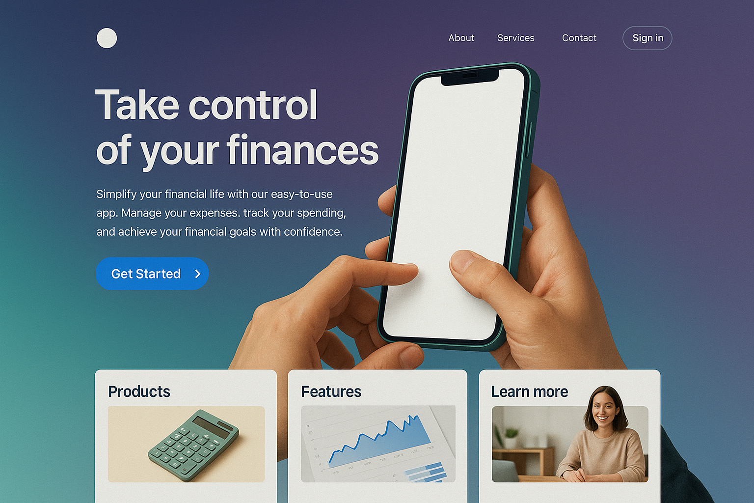/Collection: /by davooda/Type: PNG/A dynamic landing page design showcasing a green smartphone with a white screen held by two hands. The background features a gradient, enhancing the futuristic vibe. Small sans-serif typography complements the layout.
