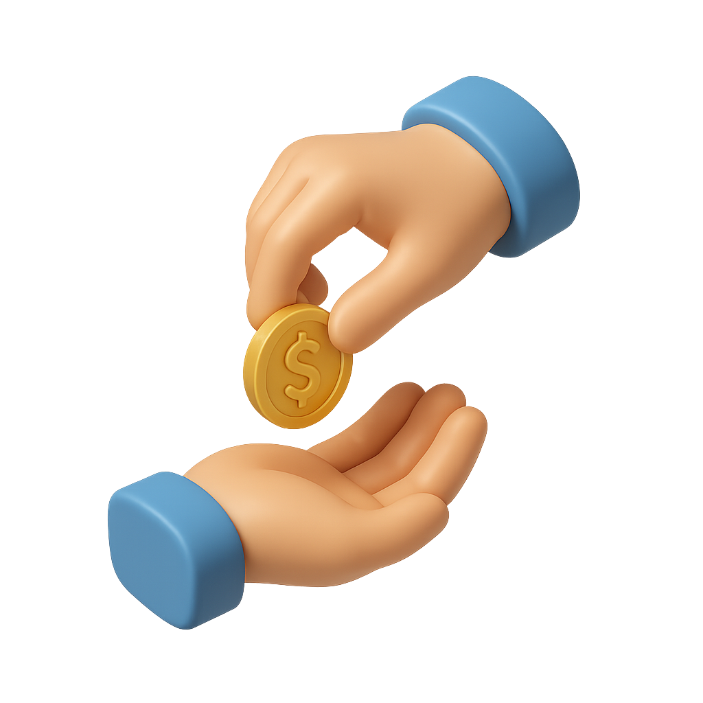 A visually appealing 3D icon depicting one hand giving a gold coin to another hand, designed with a transparent background and an isometric perspective.