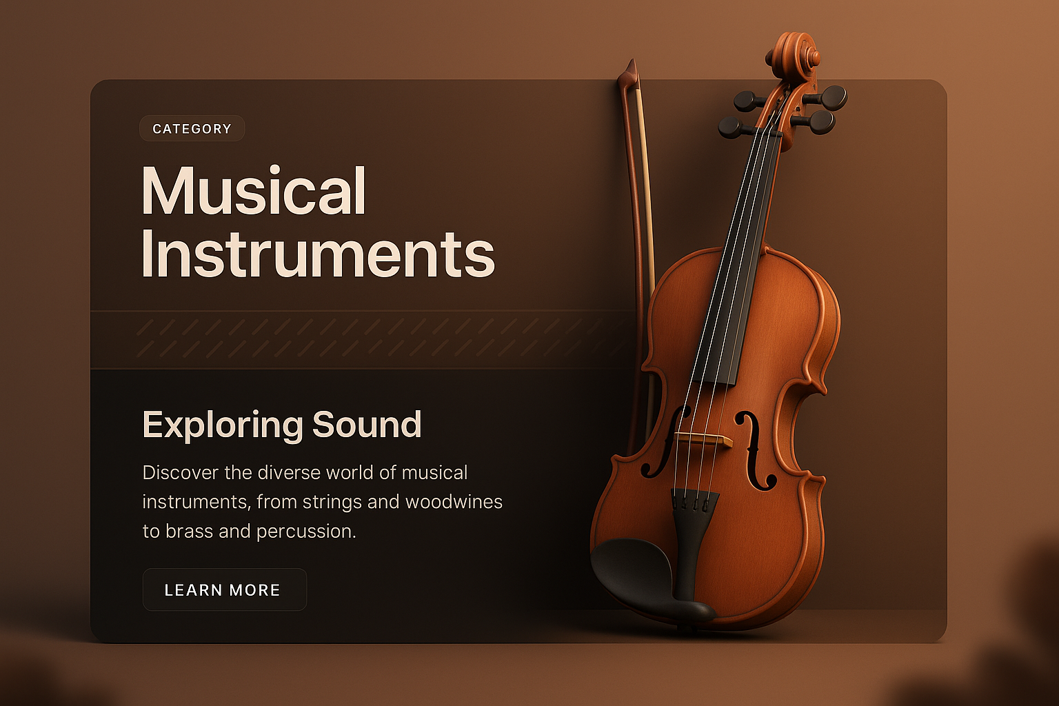 A 3D visualization of a violin integrated with an elegant dark overlay, featuring a title, text block, and decorative elements to enhance the design.