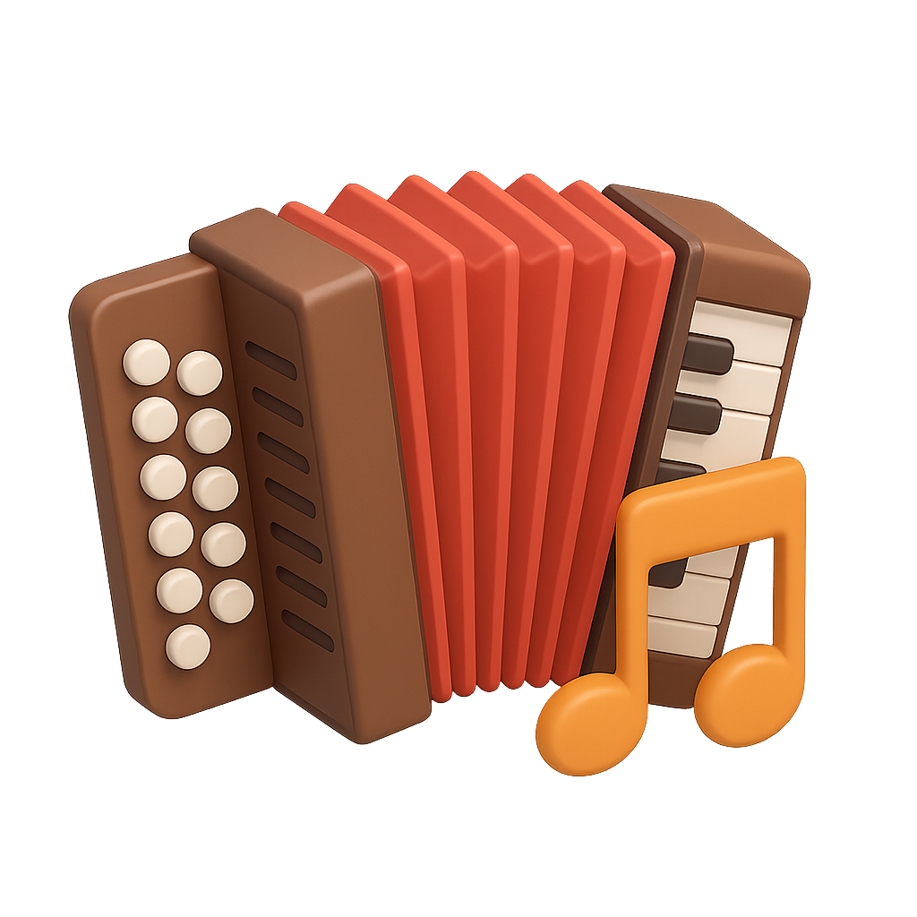 A vibrant 3D icon of an accordion featuring a rich color palette. The instrument is depicted from a three-quarter view, showcasing its details and a musical note.