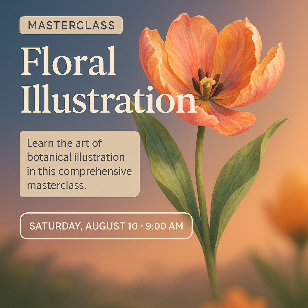 /Collection: /by davooda/Type: PNG/Engaging promotional image featuring a beautiful floral illustration, designed to advertise a masterclass on botanical art. Perfect for social media and event marketing.