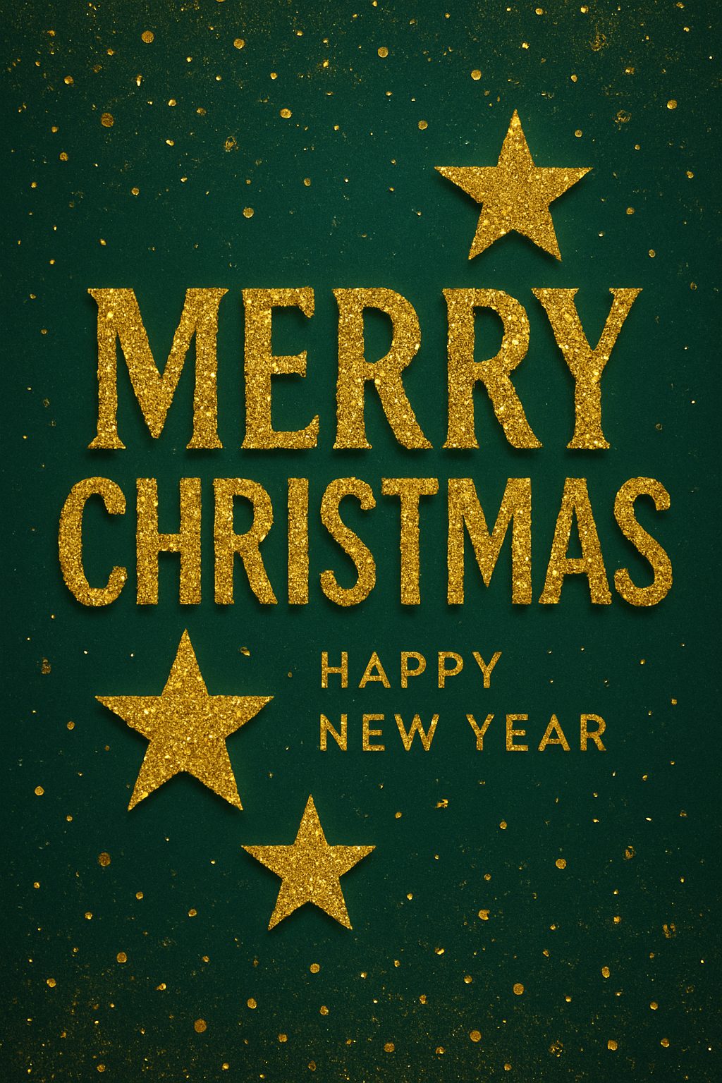 A vibrant holiday greeting card featuring golden glitter text on a dark green background, ideal for Christmas and New Year celebrations.