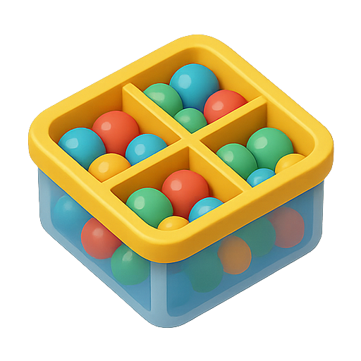 A vibrant toy featuring a square container divided into sections, holding colorful balls, designed for children's play and learning. Ideal for educational purposes.