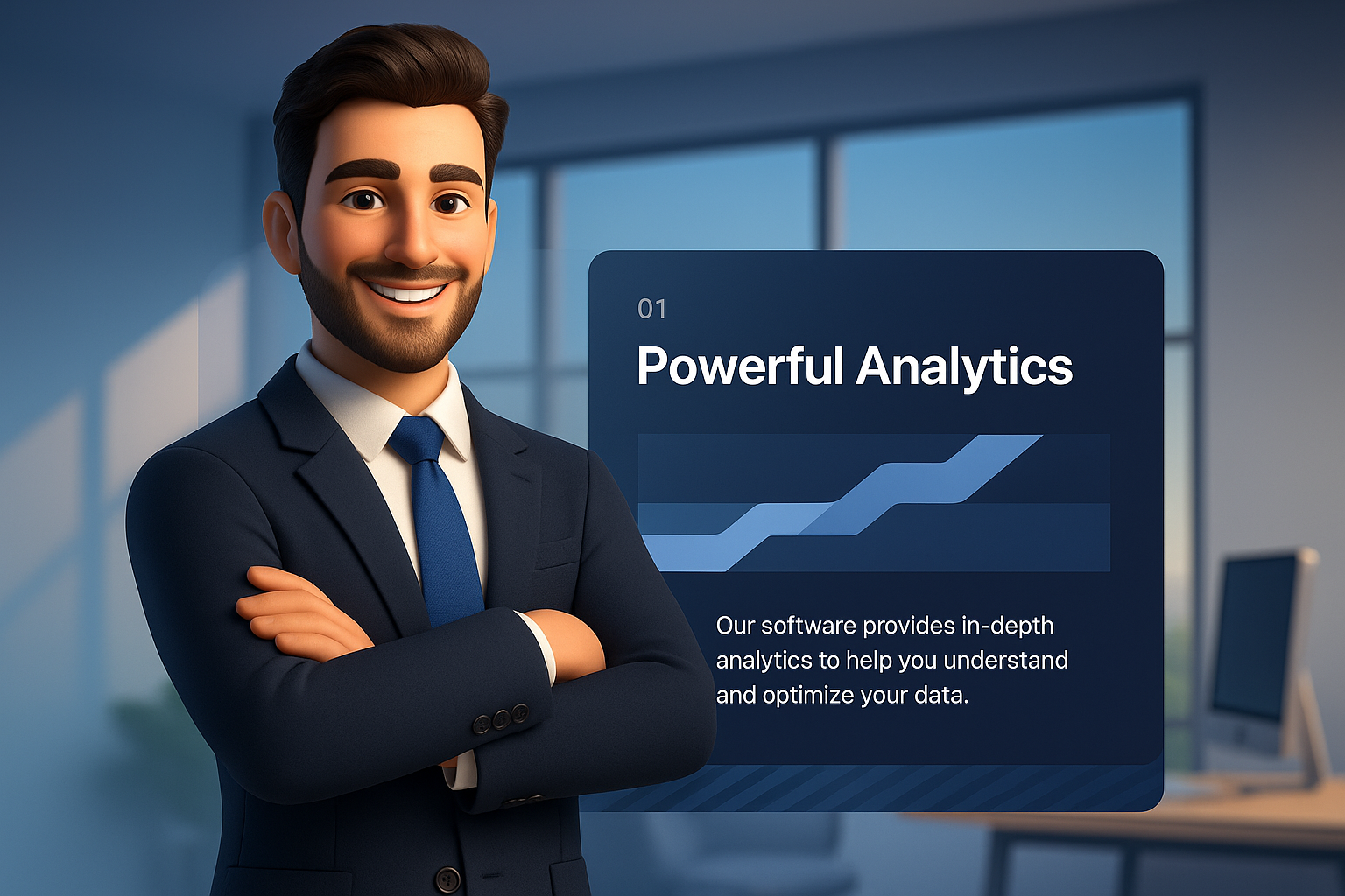 /Collection: /by davooda/Type: PNG/A smiling young businessman stands confidently in a stylish office. He is dressed in a suit and offers a welcoming demeanor, paired with a visually appealing graphic overlay highlighting powerful analytics.