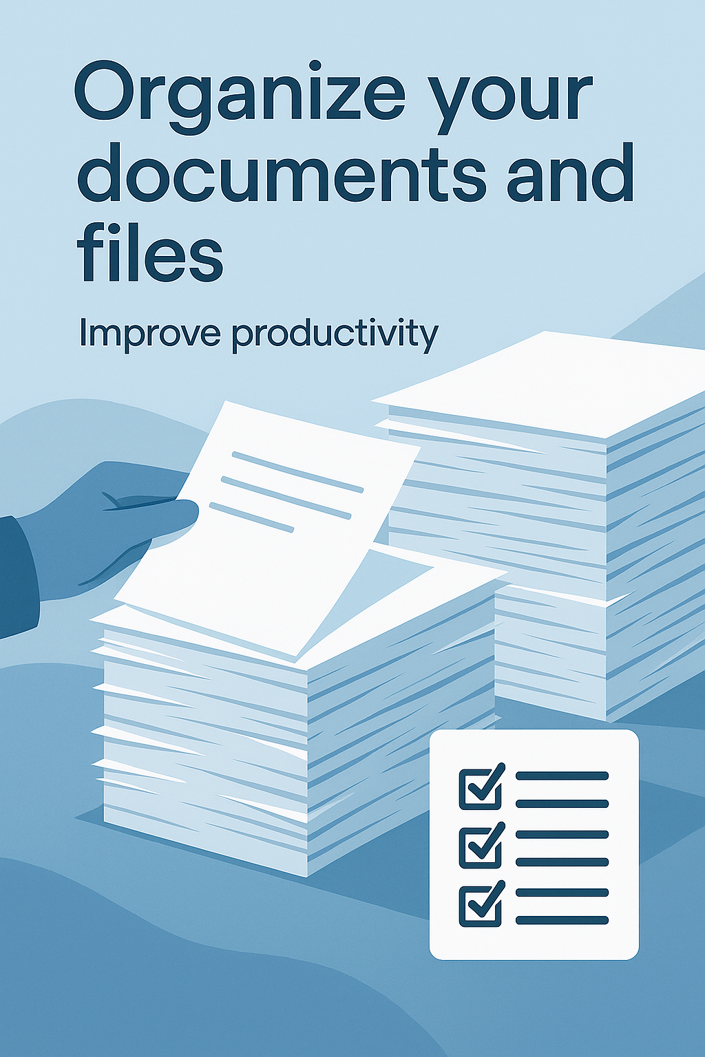 /Collection: /by davooda/Type: PNG/A visually appealing infographic promoting document and file organization to enhance productivity. Features soothing blue tones and minimalistic design elements, ideal for workplace improvement campaigns.