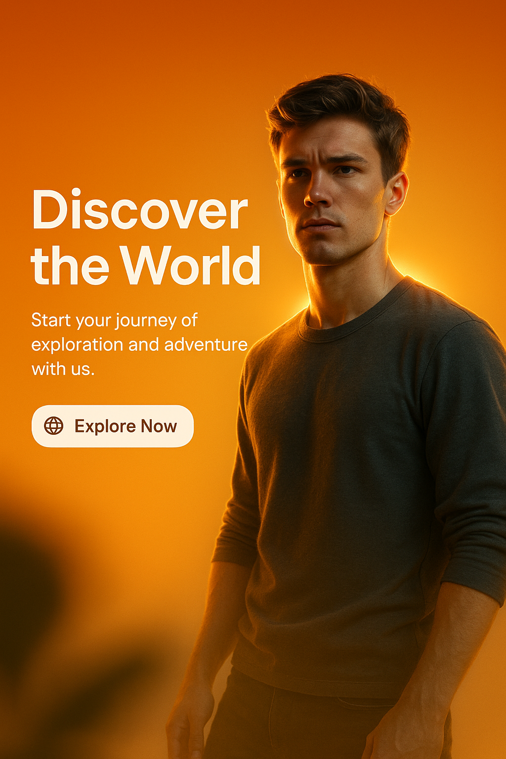 This image features a male model against a warm, gradient background, promoting travel and exploration. It is designed for social media or advertising use.