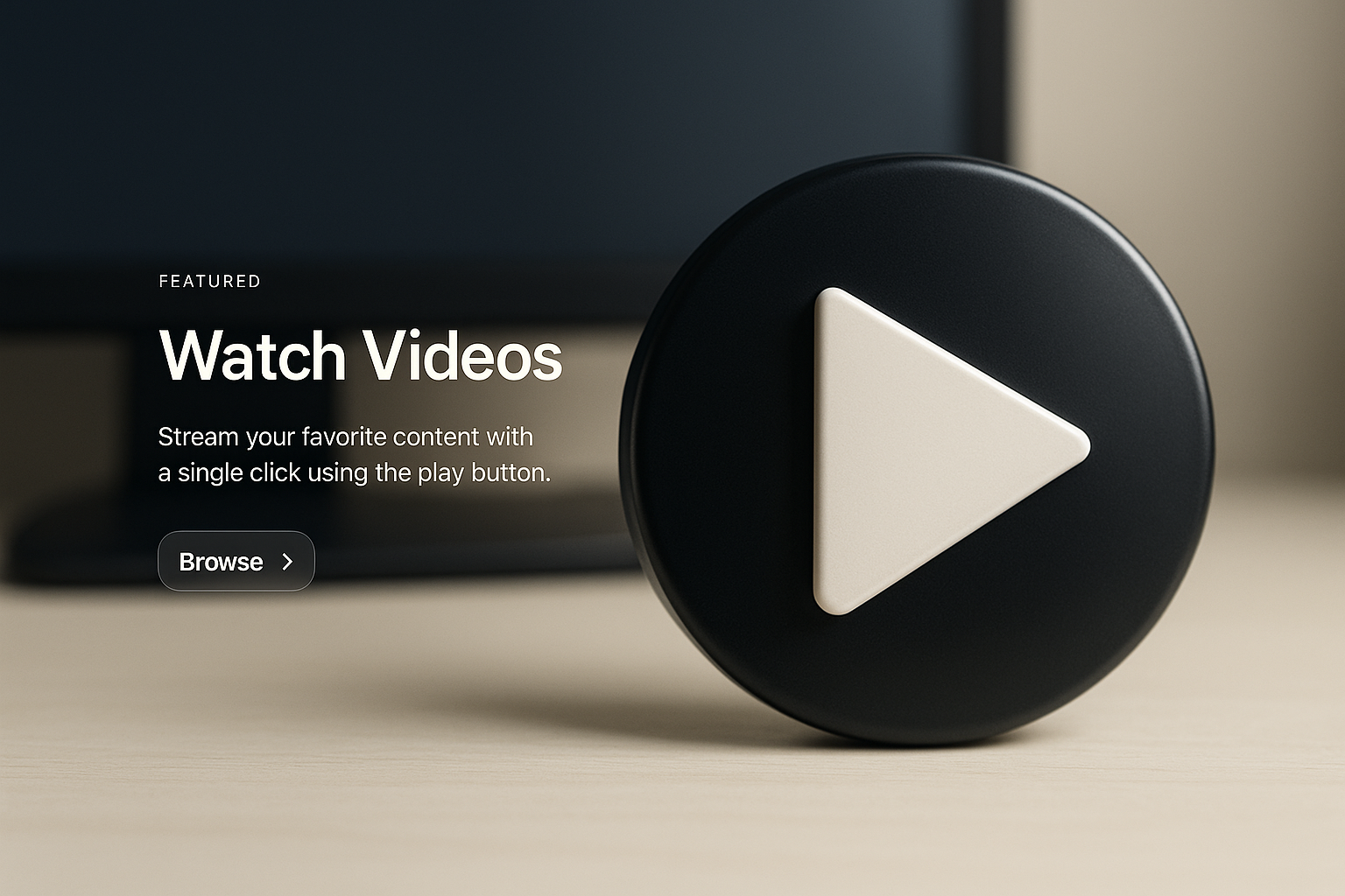 A sleek play button icon is prominently featured, set against a gradient background. Accompanying text invites users to watch videos, enhancing the visual appeal.