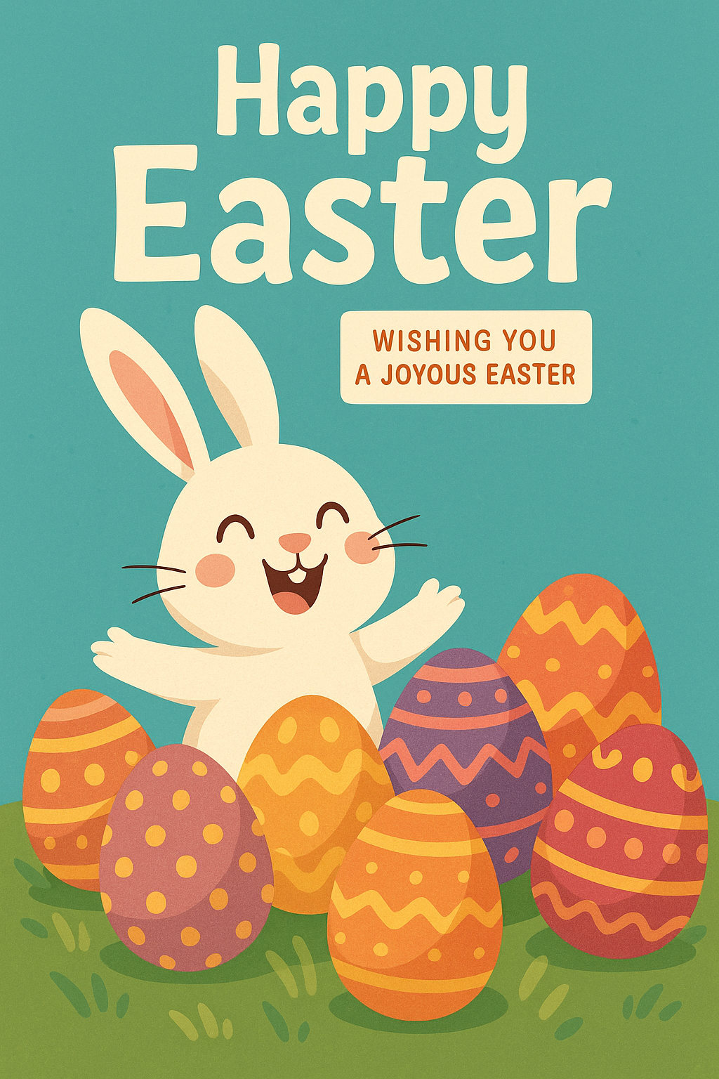 Cheerful Easter Greeting Card Featuring Cute Bunny and Colorful Eggs