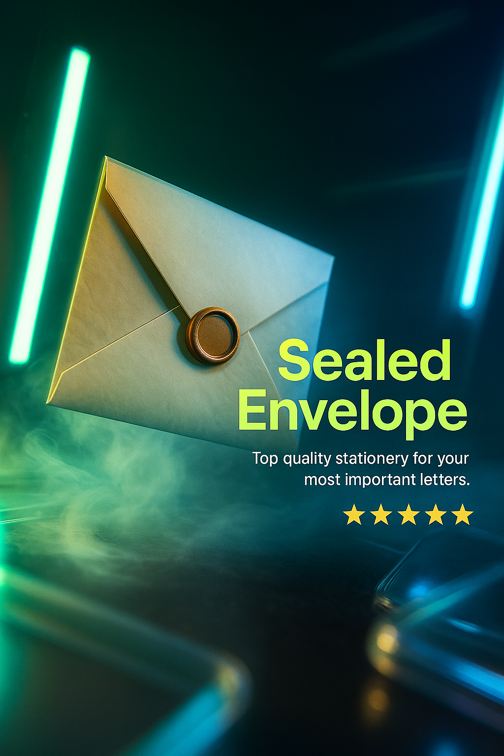 A dynamic promotional slide showcasing a sealed envelope with glowing neon accents. The design includes layered text elements and vibrant colors, creating an engaging visual appeal.