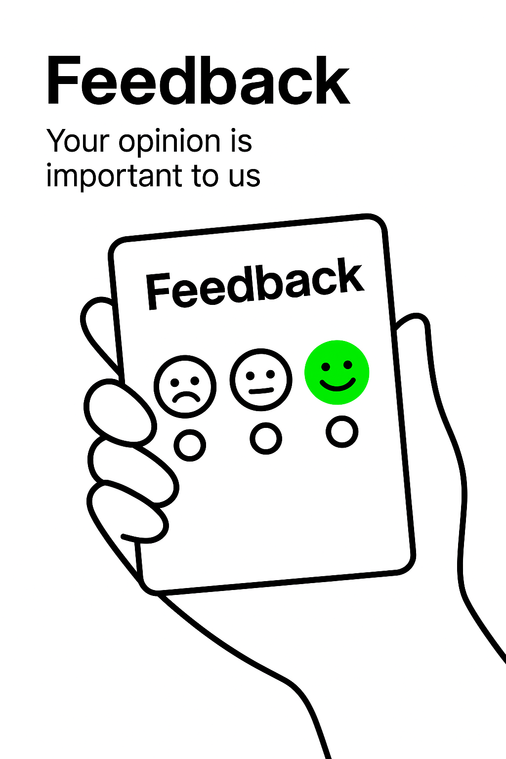 A simple and modern graphic that depicts a hand holding a feedback card featuring smiley face options, suitable for customer engagement and surveys.