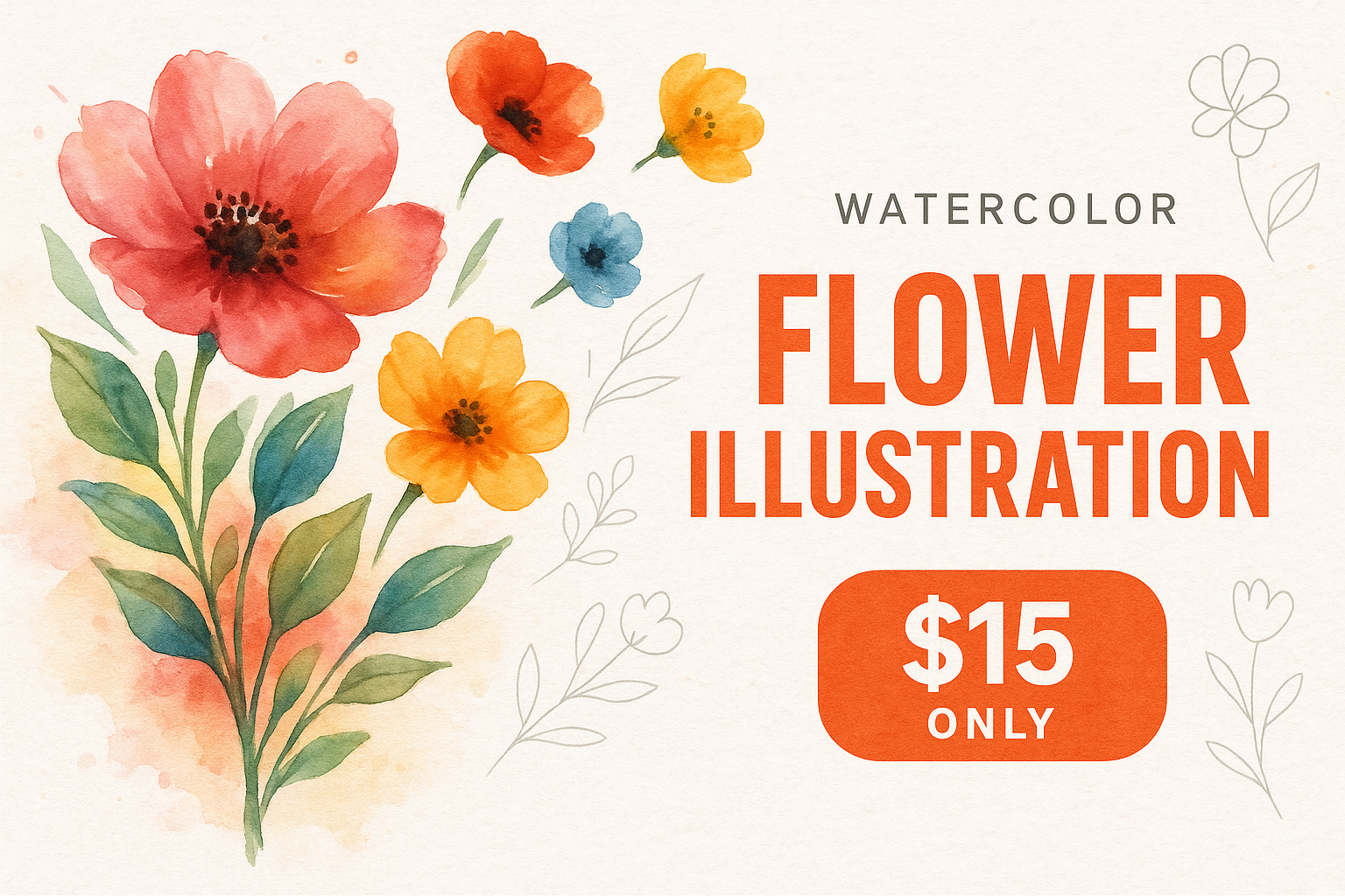 A vibrant watercolor illustration of flowers on a textured white background, featuring bold typography and a price tag, creating a dynamic advertisement.