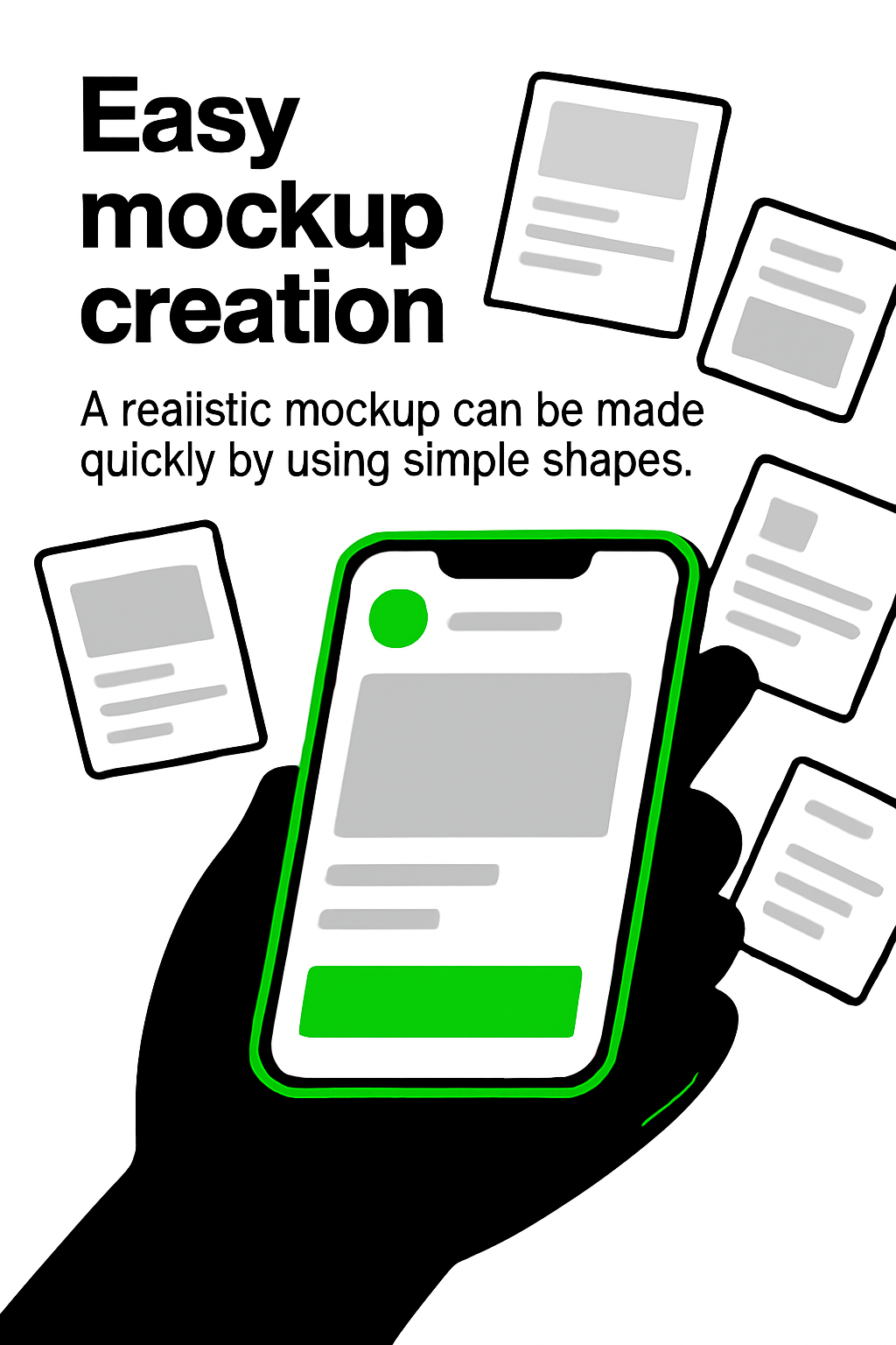 Stylized graphic illustrating mobile mockup creation, featuring a hand holding a smartphone with design elements. Ideal for design tutorials and educational content.