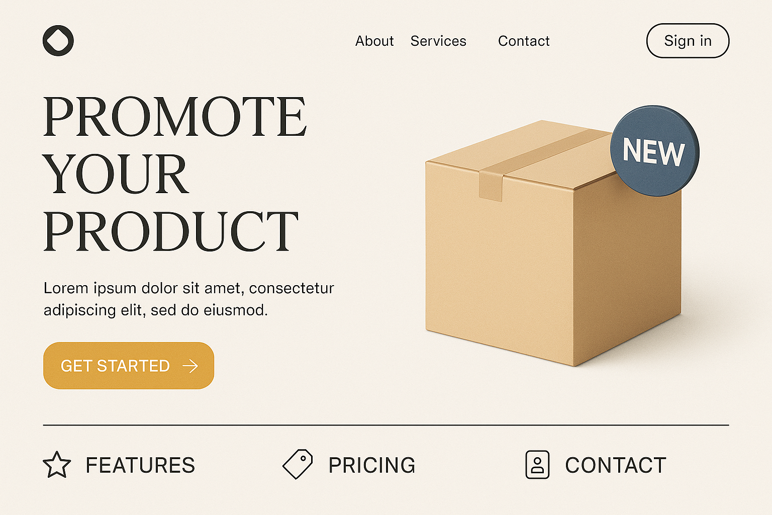 /Collection: /by davooda/Type: PNG/A modern corporate landing page layout featuring a prominent call-to-action button, clear typography, and a styled product box illustration. The design is minimalistic with a two-column structure.