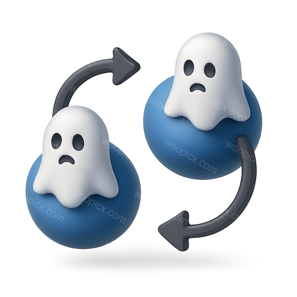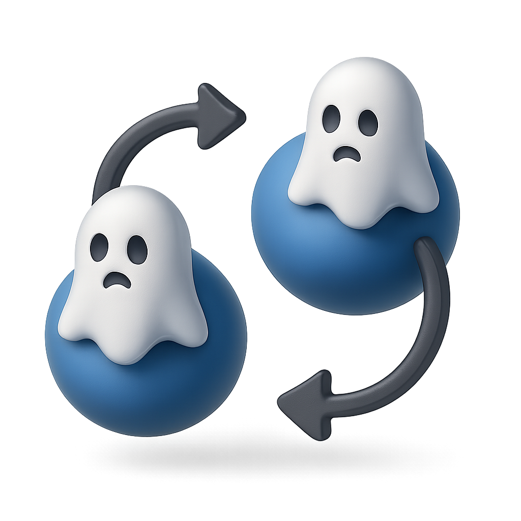 A stylized 3D icon representing quantum entanglement, featuring two ghostly figures on blue spheres. The design includes arrows indicating interaction, set against a gradient background.