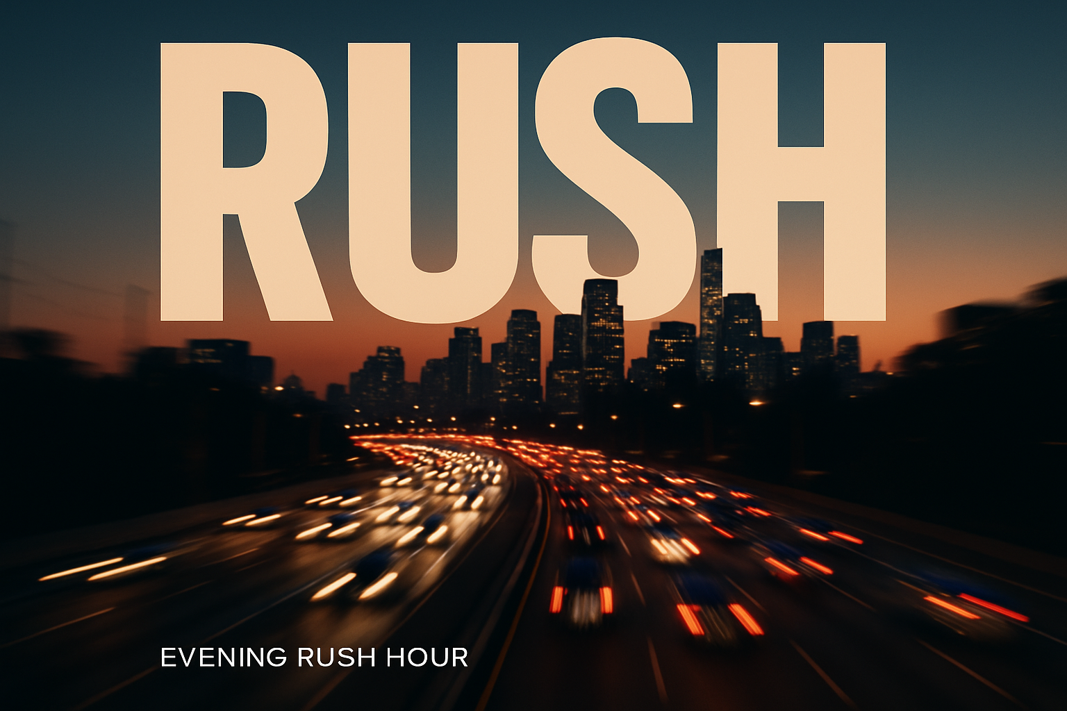/Collection: /by davooda/Type: PNG/A striking image capturing the motion blur of a bustling urban highway during evening rush hour, framed by a glowing city skyline. The bold word 'RUSH' dominates the upper half, evoking a modern cinematic mood.