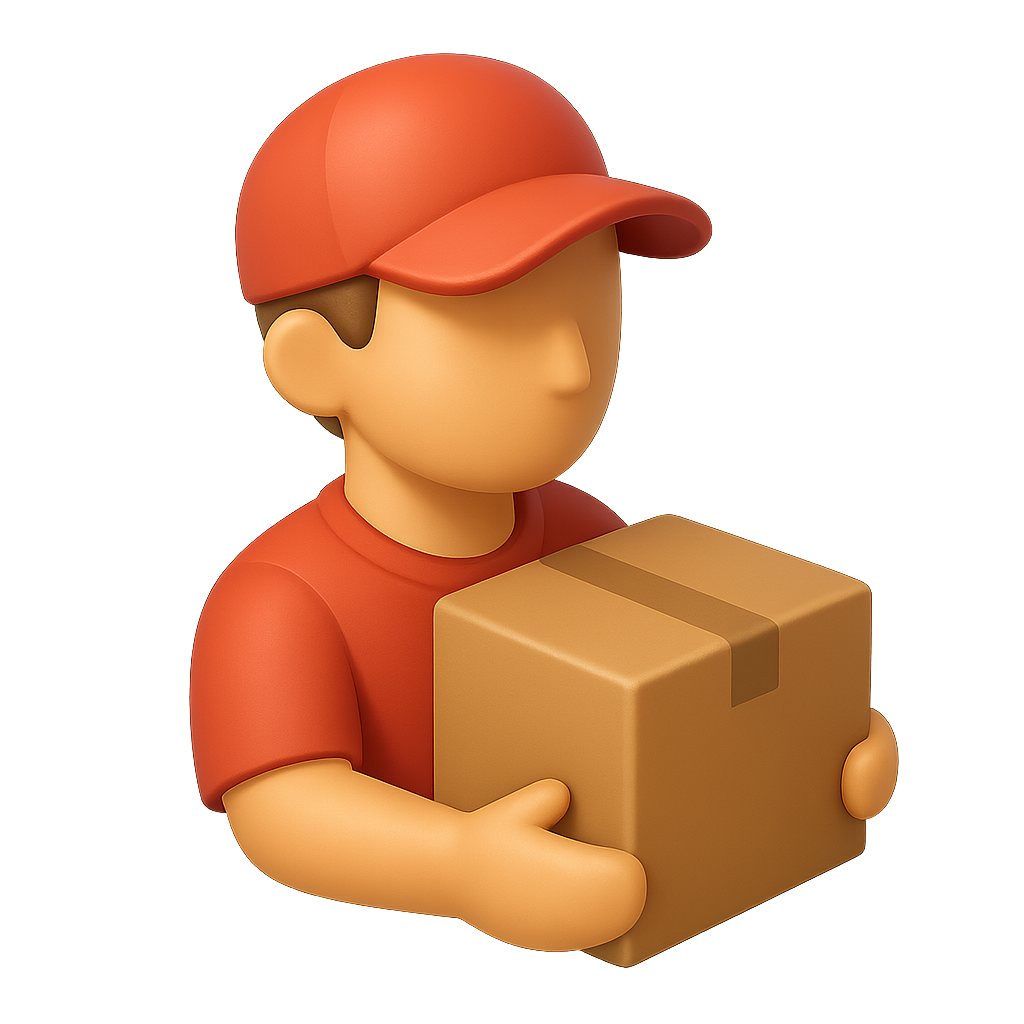 A vibrant 3D icon representing a courier character holding a package. The character wears a red cap and shirt, set against a gradient background that enhances its volumetric appearance.