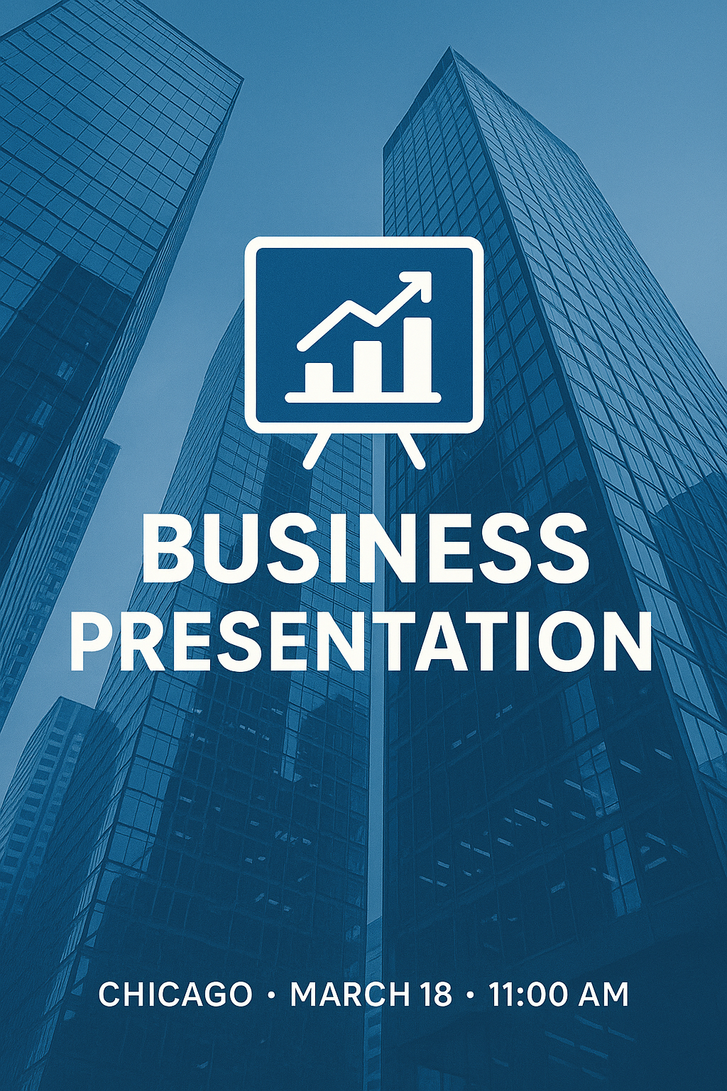 Professional announcement graphic featuring a business presentation theme with sleek skyscraper imagery, suitable for corporate events and meetings.