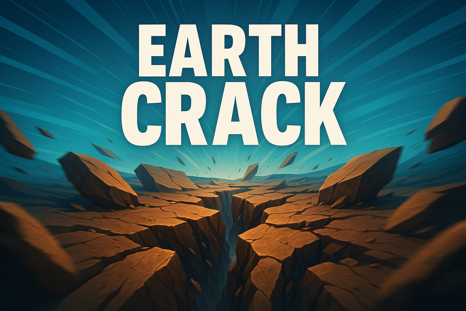A striking 3D illustration depicting a deep earth crack with dynamic lines emanating from the center, surrounded by rocky formations. The bold title 'EARTH CRACK' prominently stands out against a gradient backdrop.