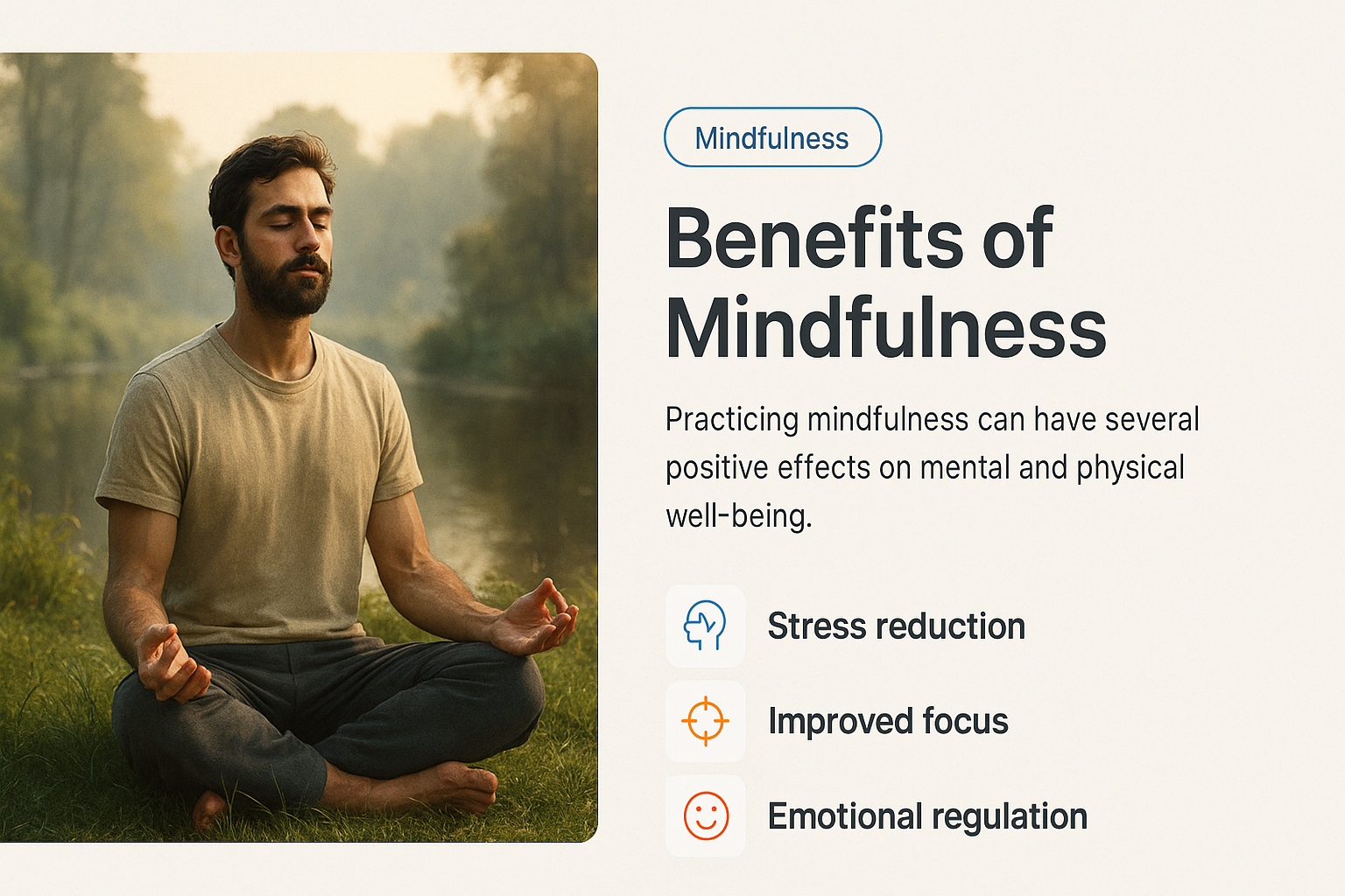 A serene graphic highlighting the benefits of mindfulness with a calm visual style, ideal for wellness blogs or social media awareness campaigns.